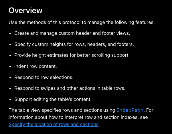 - 각 메서드들은 TableView의 동작을 세밀하게 커스터마이징할 수 있는 다양한 기능을 제공합니다.
