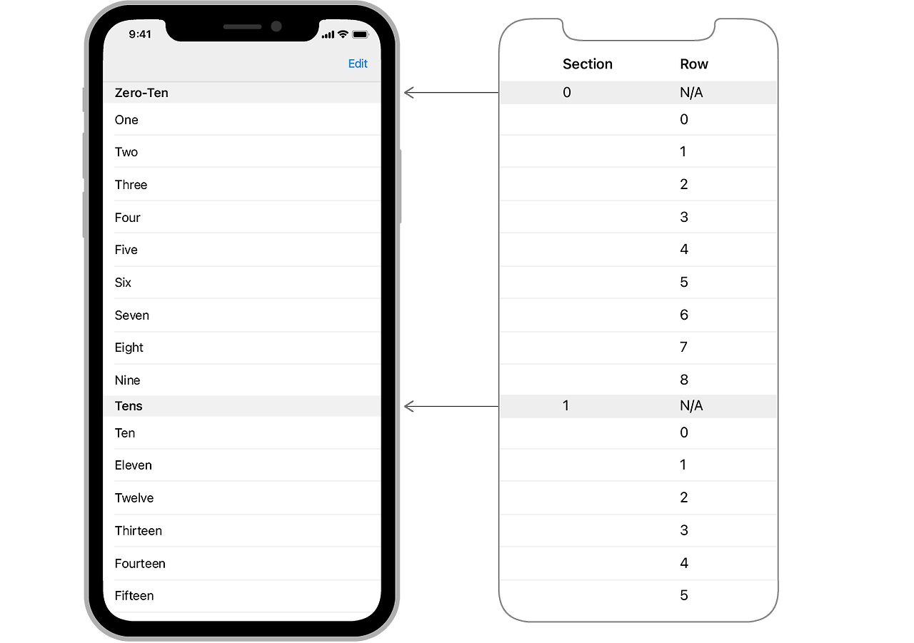 테이블 뷰를 구성하여 긴 목록의 행을 표시할 수 있고 관련된 섹션으로 나눠서 행을 그룹으로 만들어 표시하여