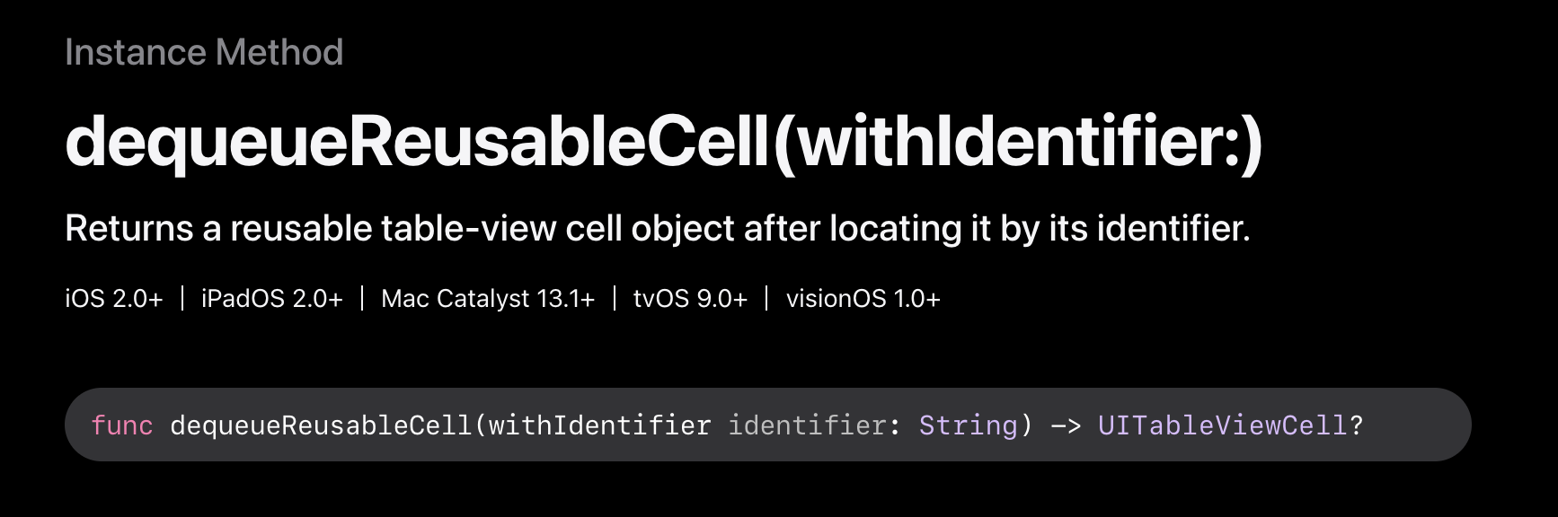 - cellForRowAt: 특정 인덱스 Row의 Cell에 대한 정보를 넣어 Cell을 반환하는 메서드 (필수)