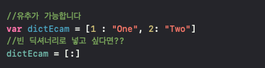 그리고 딕셔너리는 유추와 빈배열을 바로 넣을 수 있답니다