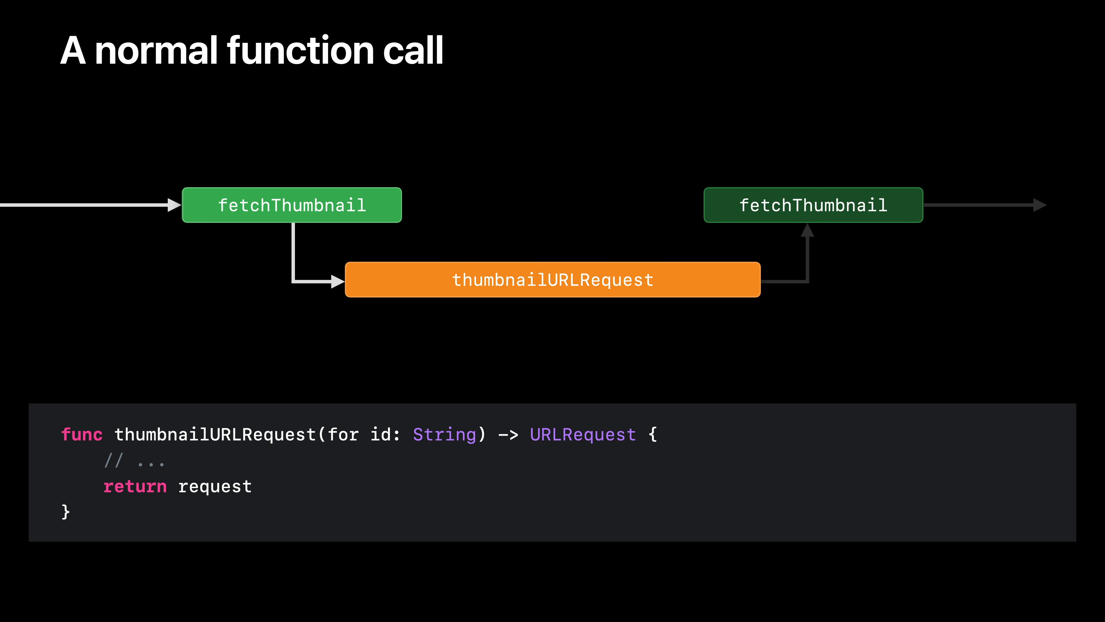 함수를 호출하면 함수가 실행 중인 스레드의 제어권을 해당 함수에 넘깁니다. 여기서 thumbnailURLRequest와 같이 호출하는 함수가 일반 함수인 경우 스레드는 해당 함수가 완료될 때까지 해당 함수를 대신하여 작업을 수행하며 완전히 사용하게 됩니다.