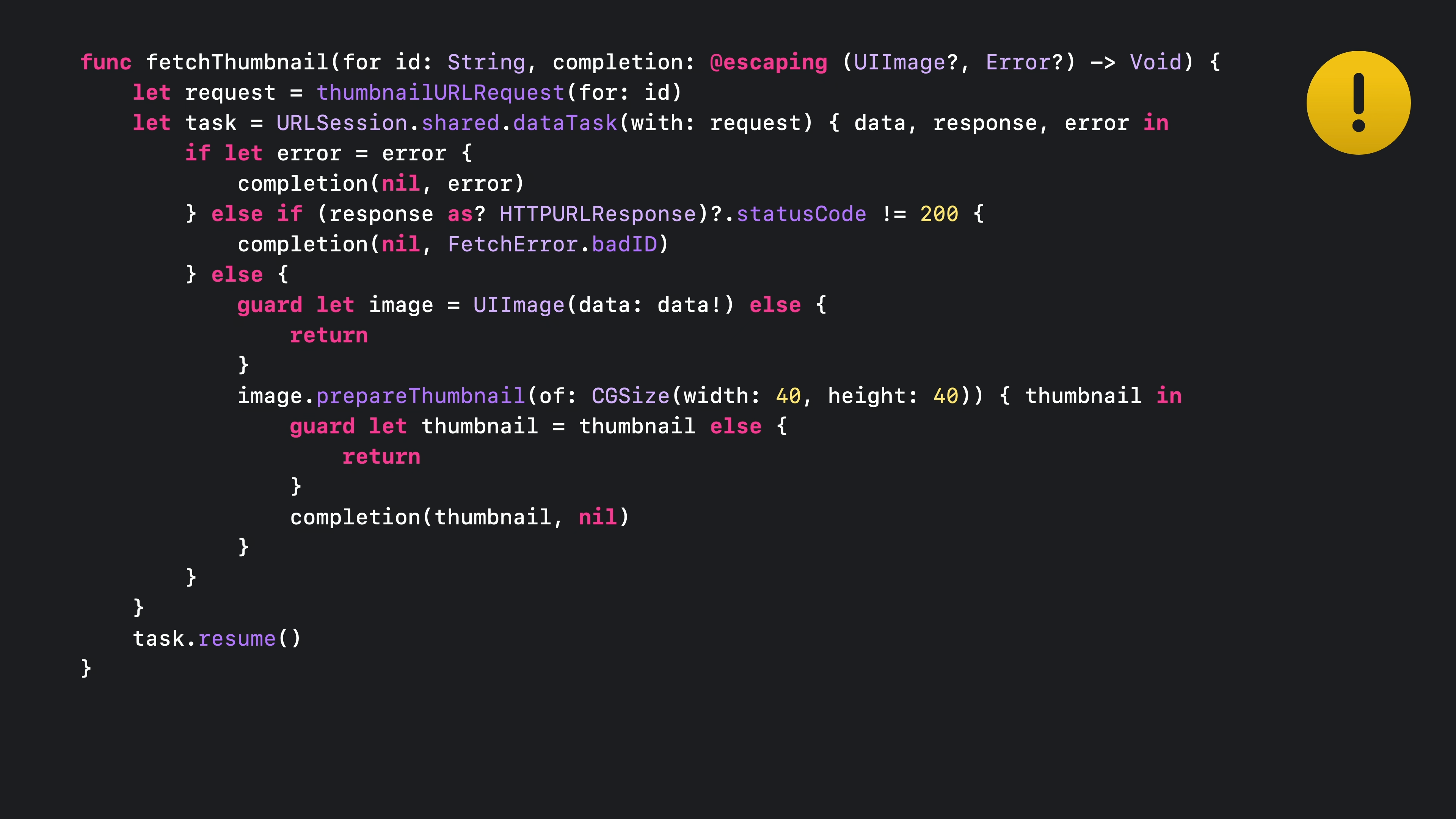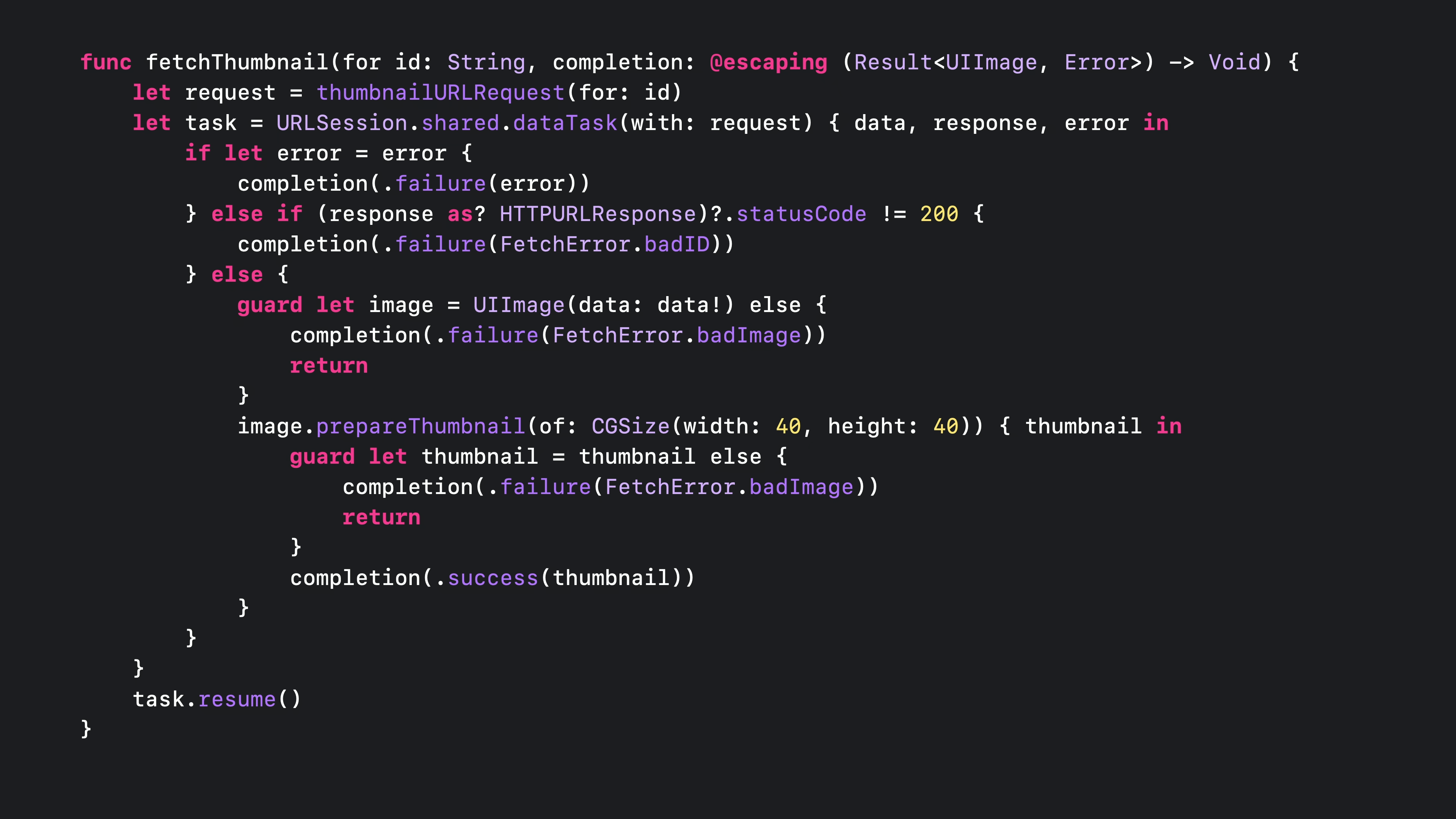 fetchThumbnail이 호출되면 먼저 thumbnailURLRequest를 호출합니다.이 메서드는 동기식이기 때문에 완료 핸들러가 필요하지 않습니다.다음으로 공유 URLSession 인스턴스에서 데이터 태스크를 호출하여 해당 URLRequest와 완료 핸들러를 전달합니다.비동기 작업을 시작하기 위해 다시 시작해야 하는 URLSessionDataTask를 동기적으로 생성합니다.그런 다음 FetchThumbnail이 반환되고 스레드는 다른 작업을 자유롭게 수행할 수 있습니다.