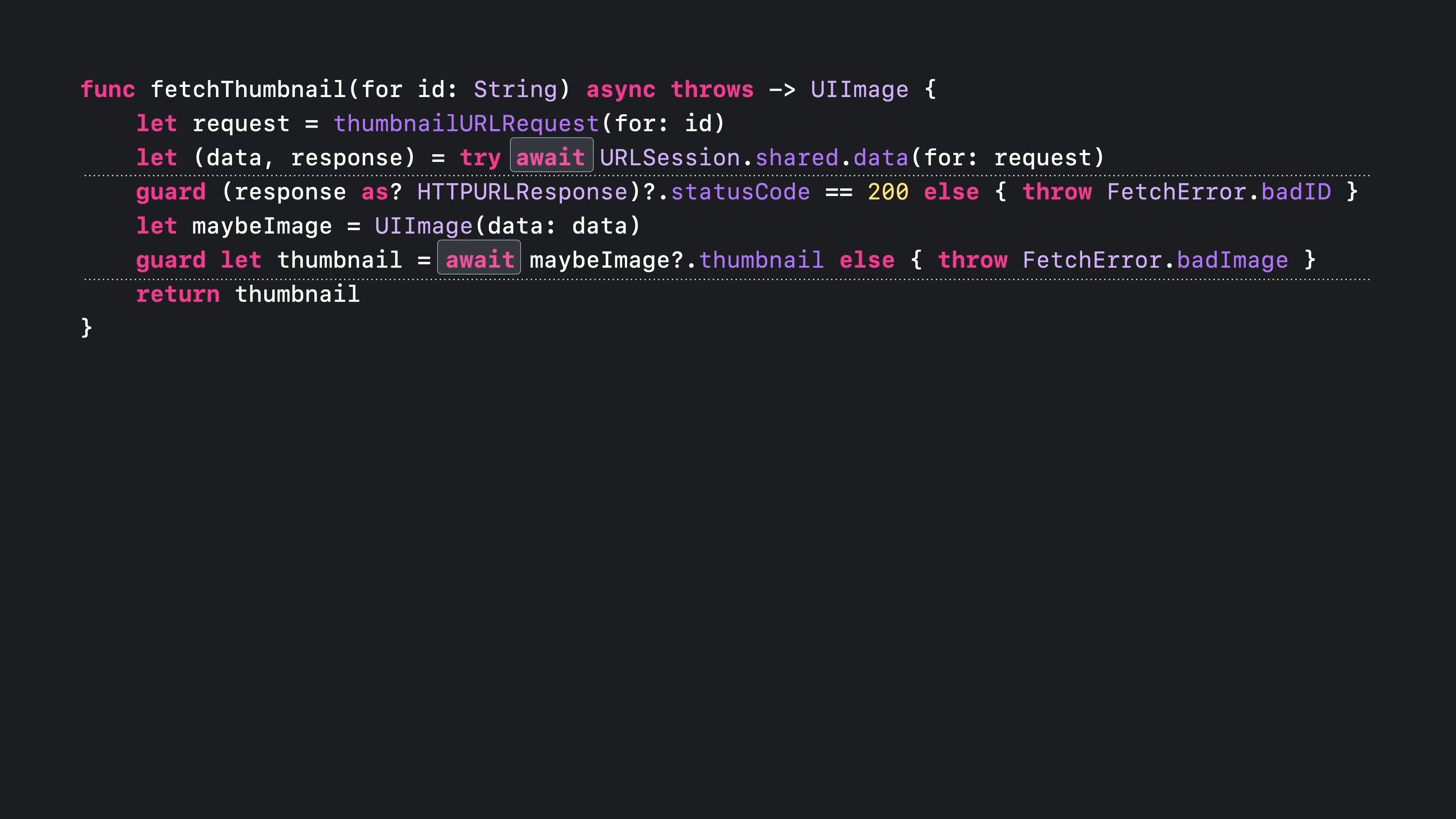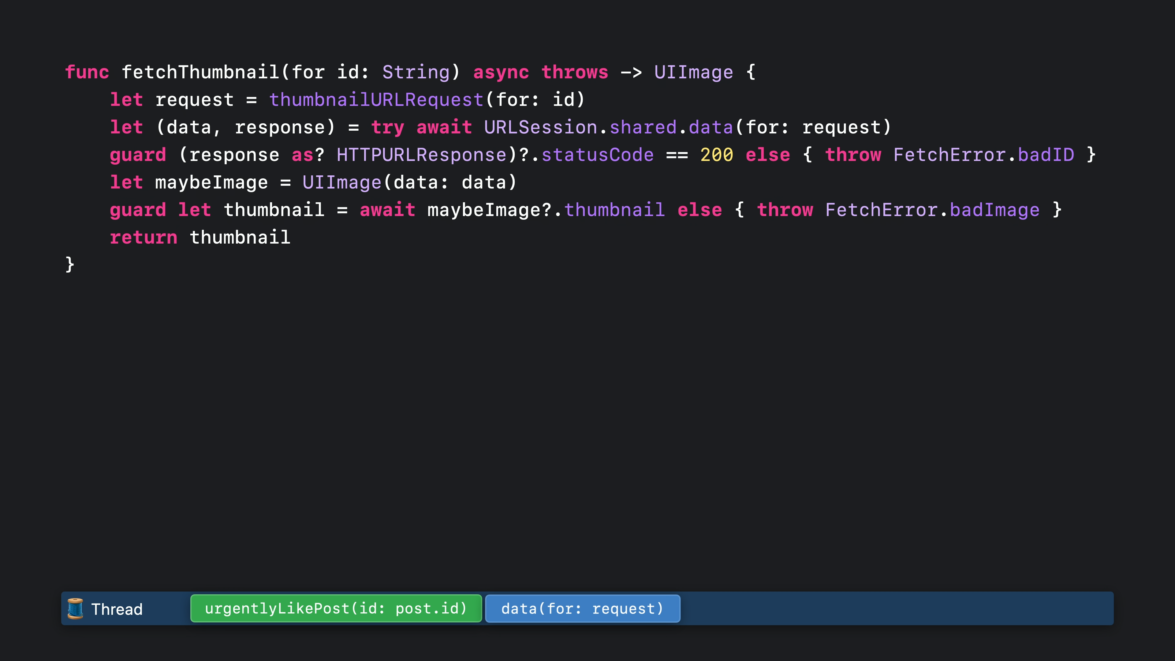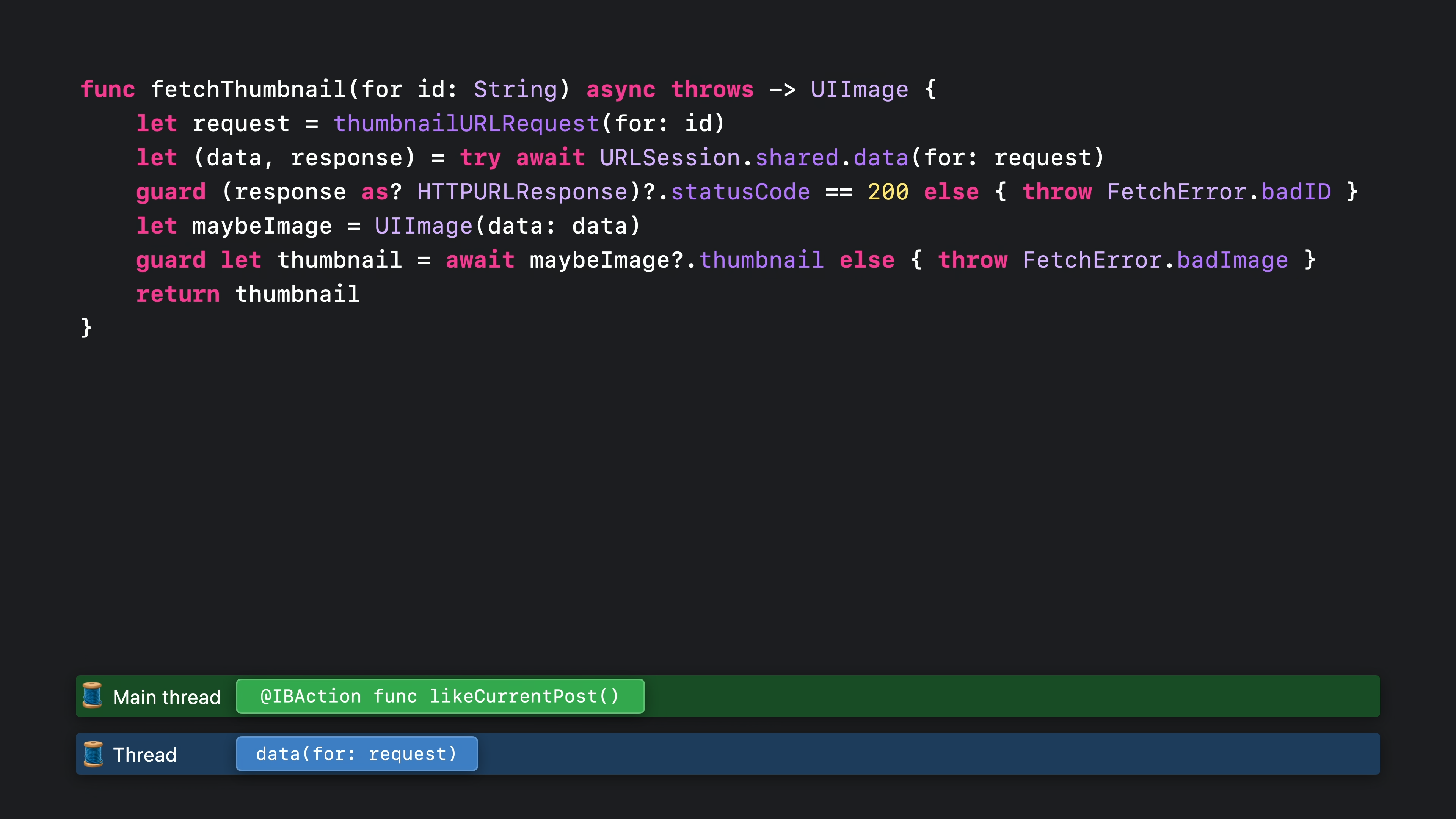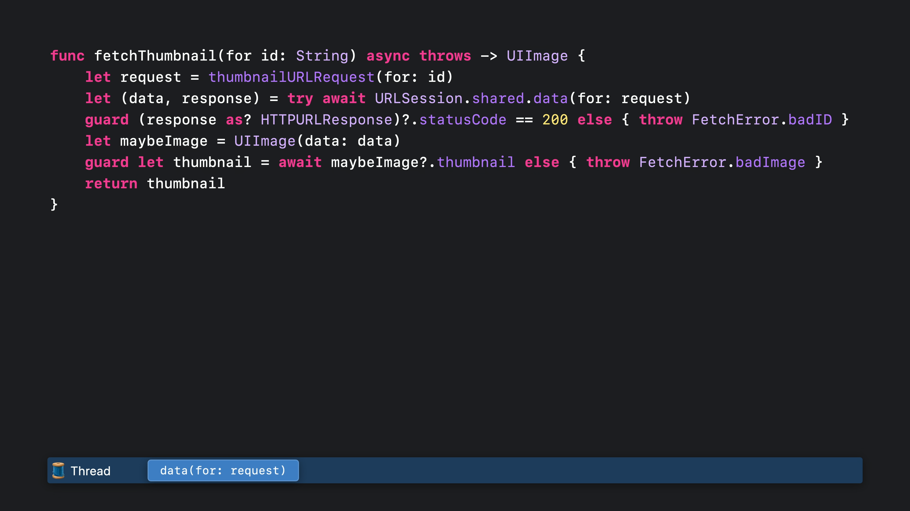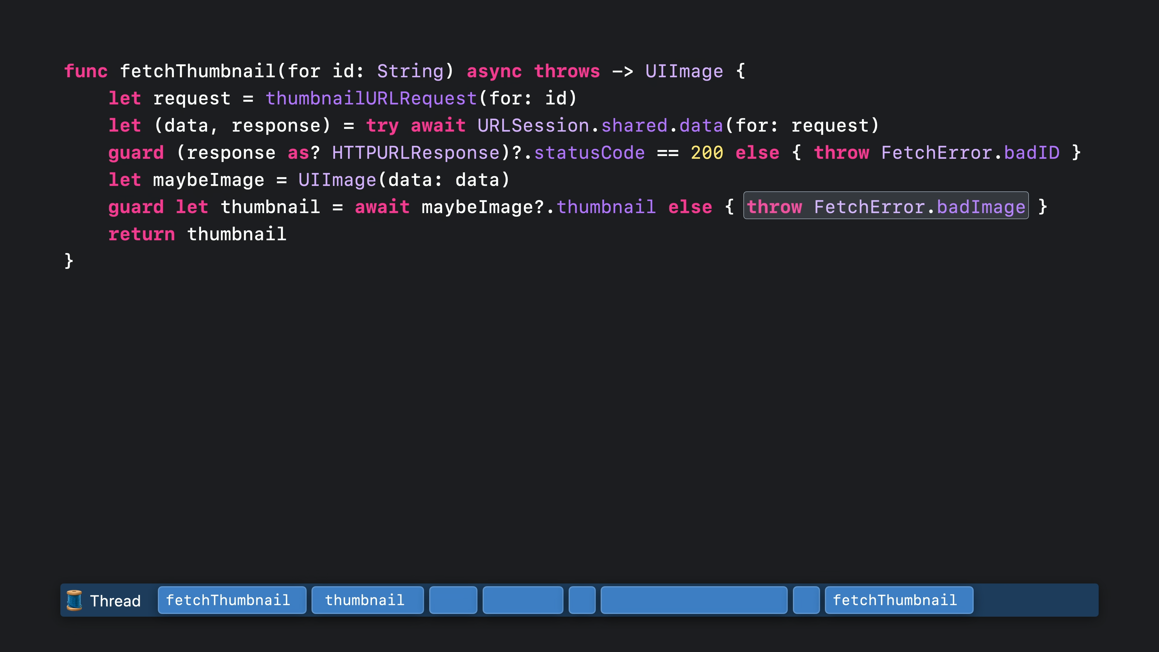 이 함수는 여전히 문자열을 인수로 받습니다. 하지만 지난번에는 완료 핸들러도 전달했지만 이번에는 그 대신 비동기 함수를 사용했습니다. 함수를 비동기로 표시할 때 키워드는 함수 시그니처의 “throw” 바로 앞에, 또는 함수가 던지지 않는 경우 화살표 앞에, 이렇게 표시해야 합니다. 함수를 비동기로 표시하면 함수와 그 서명이 더 간단해집니다. 이미지 썸네일이 성공적으로 생성되면 해당 썸네일만 반환됩니다. 그리고 오류가 발생하면 그냥 던져집니다. fetchThumbnail이 호출되면 이전과 마찬가지로 thumbnailURLRequest를 호출하는 것으로 시작합니다. 이 함수는 동기식이기 때문에 스레드가 차단되면서 작업을 수행합니다.