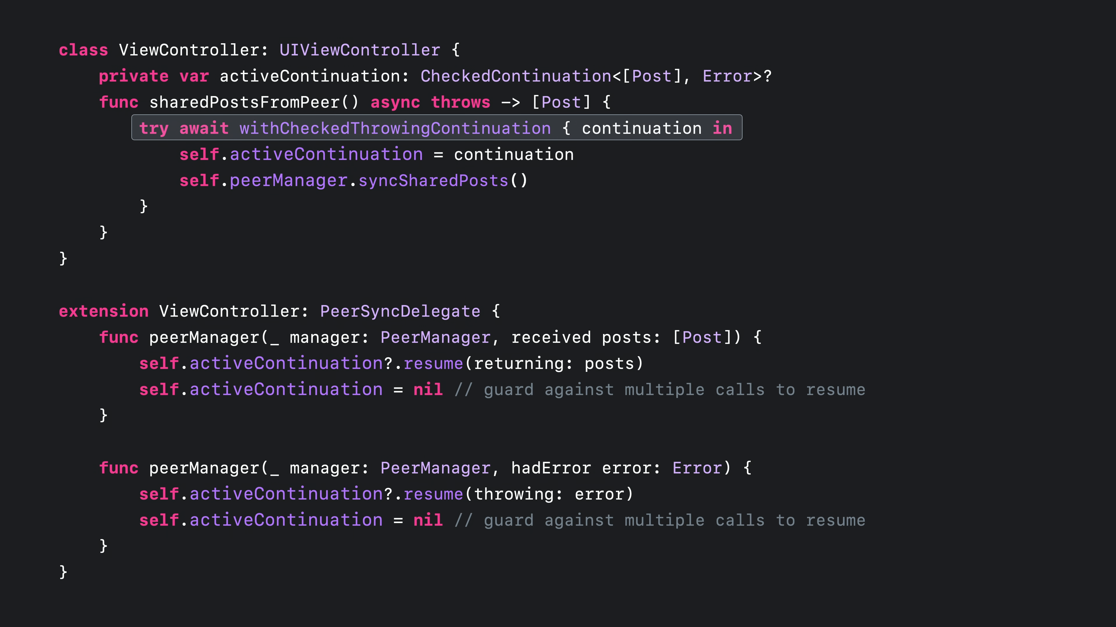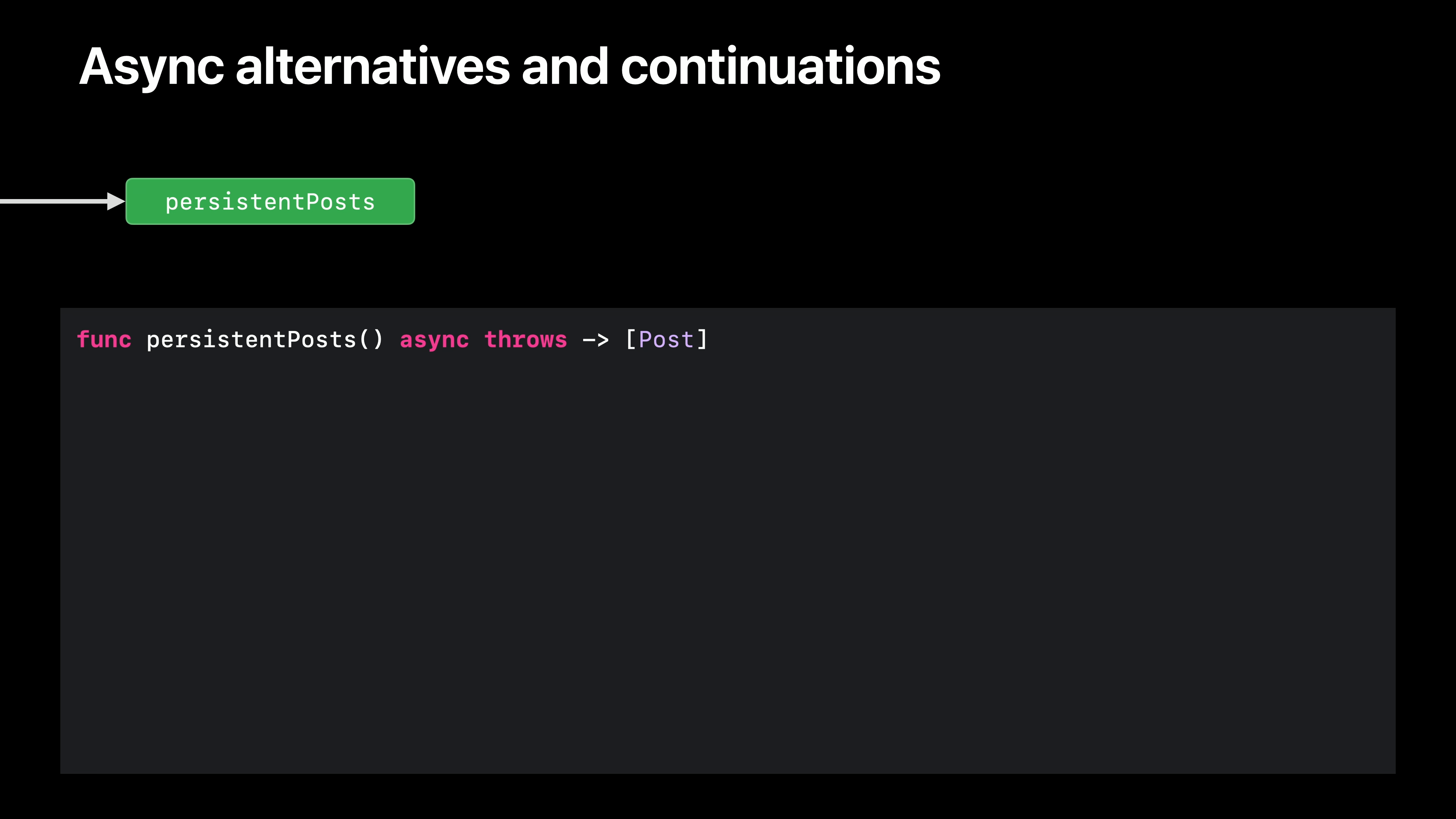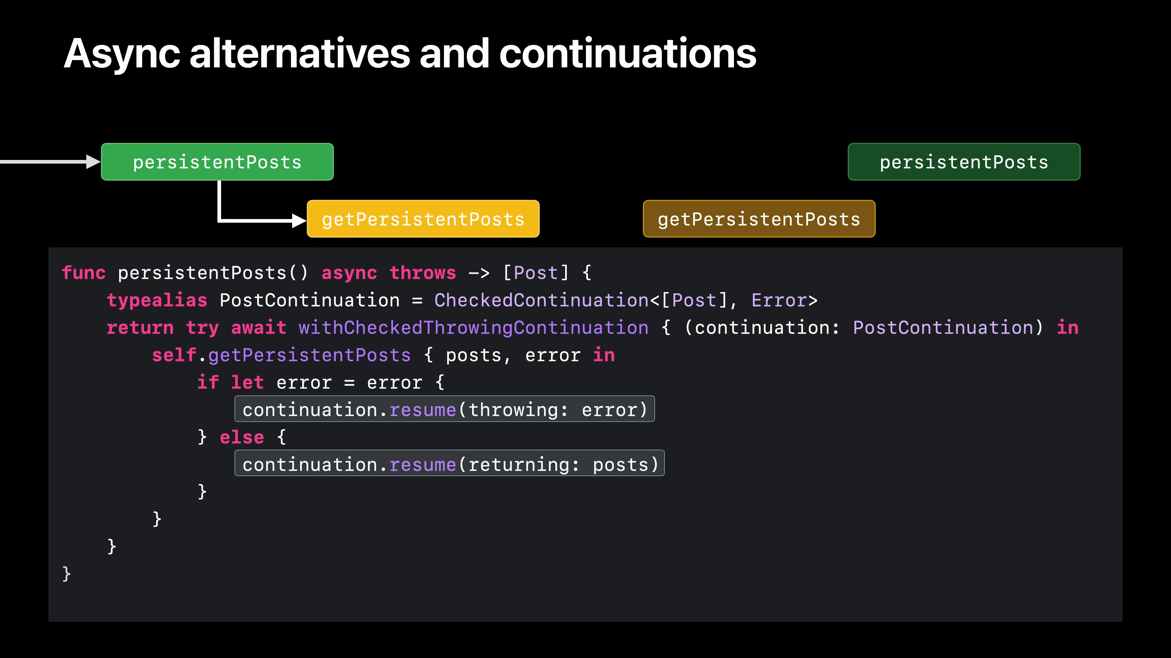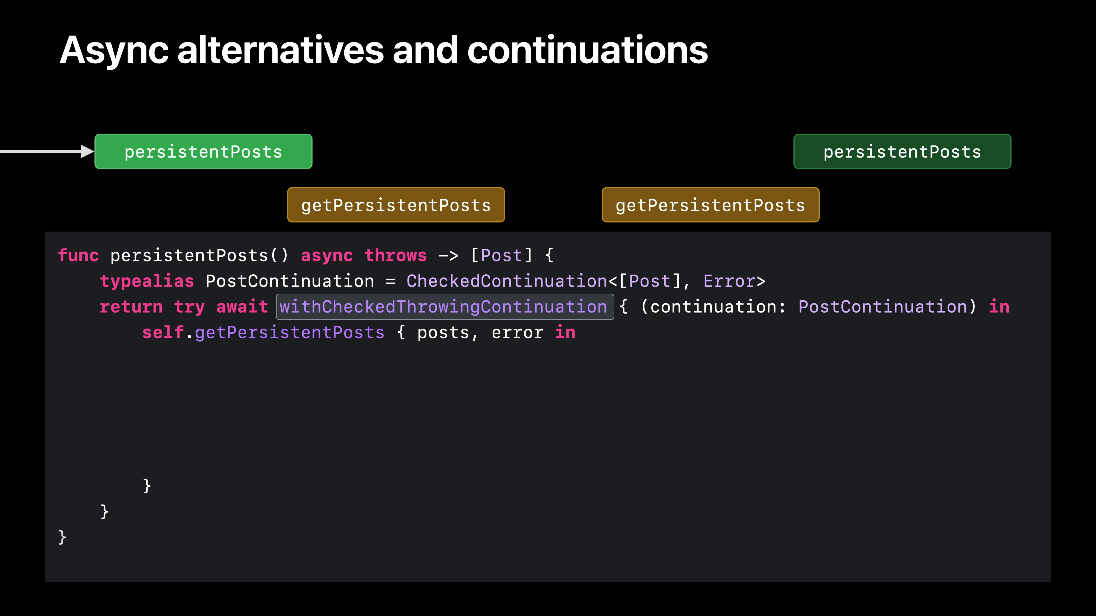 withCheckedThrowingContinuation 함수는 오류가 있는 완료 블록을 비동기 Swift 함수를 던질 때까지 해제합니다. 함수가 에러를 던지지 않을 것이라는 것을 알고 있는 경우를 위해 withCheckedContinuations라는 대응 함수가 있습니다. 이 함수는 일시 중단된 비동기 함수를 재개하는 데 사용할 수 있는 연속 값에 액세스하는 방법입니다. 또한 getPersistentPosts에 대한 호출을 기다릴 수 있게 함으로써 브리지의 첫 번째 부분을 구축합니다.