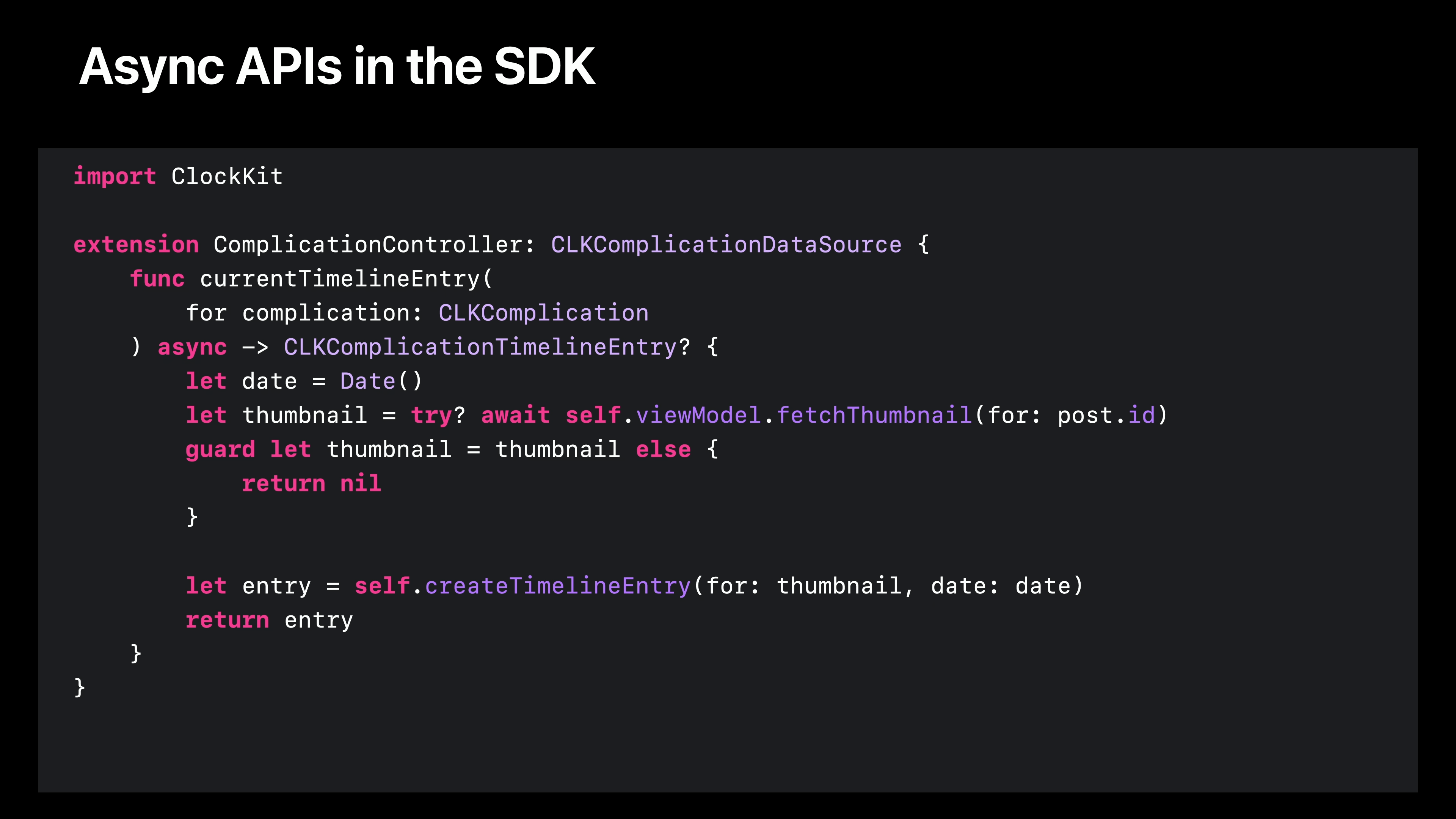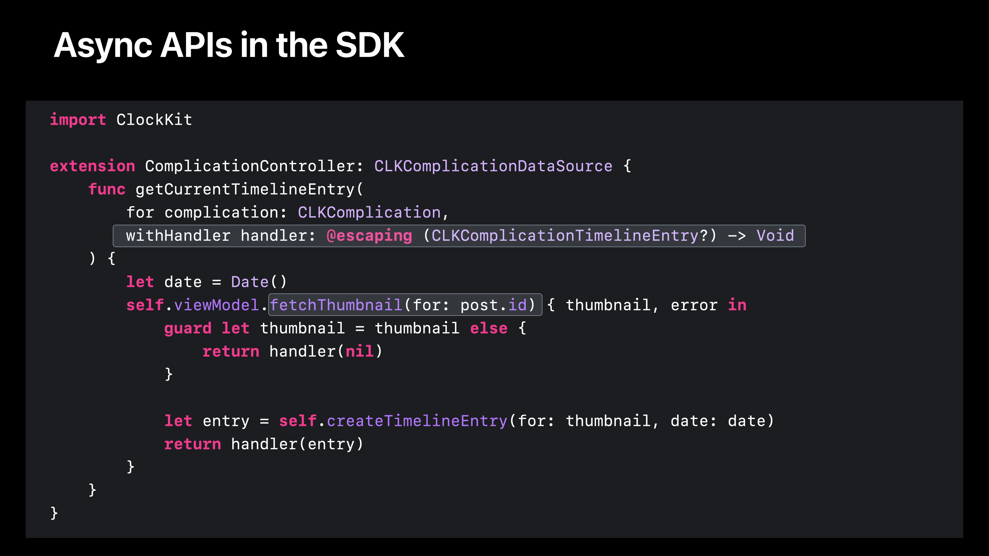 이름도 다르고 목적도 다르지만, 이 모든 함수는 동일한 필수 API 계약을 가지고 있습니다. 사용자가 함수를 호출하면 함수는 제공된 완성 핸들러로 다시 호출하여 얻은 결과를 전달합니다. 앞서 네이트는 비동기 함수의 결과를 기다리면 보다 자연스러운 코드를 작성할 수 있다는 것을 보여드렸습니다. 이러한 콜백 블록을 이러한 비동기 함수로 바꿀 수 있다면 정말 멋지지 않을까요? Swift 5.5부터 바로 이런 일이 가능합니다. Swift 컴파일러는 Objective-C에서 가져온 완성 핸들러 코드를 자동으로 살펴보고 비동기 대안을 제공합니다. 하지만 여기서 멈추지 않았습니다. 많은 델리게이트 API에는 완료 핸들러를 전달하는 메서드도 포함되어 있습니다. 핸들러를 호출하면 비동기 작업이 완료되면 프레임워크에 협조적으로 알려줍니다. 특정 글의 타임라인 항목을 표시하기 위해 fetchThumbnail을 호출하는 ClockKit 컴플리케이션 데이터 소스를 예로 들어보겠습니다.