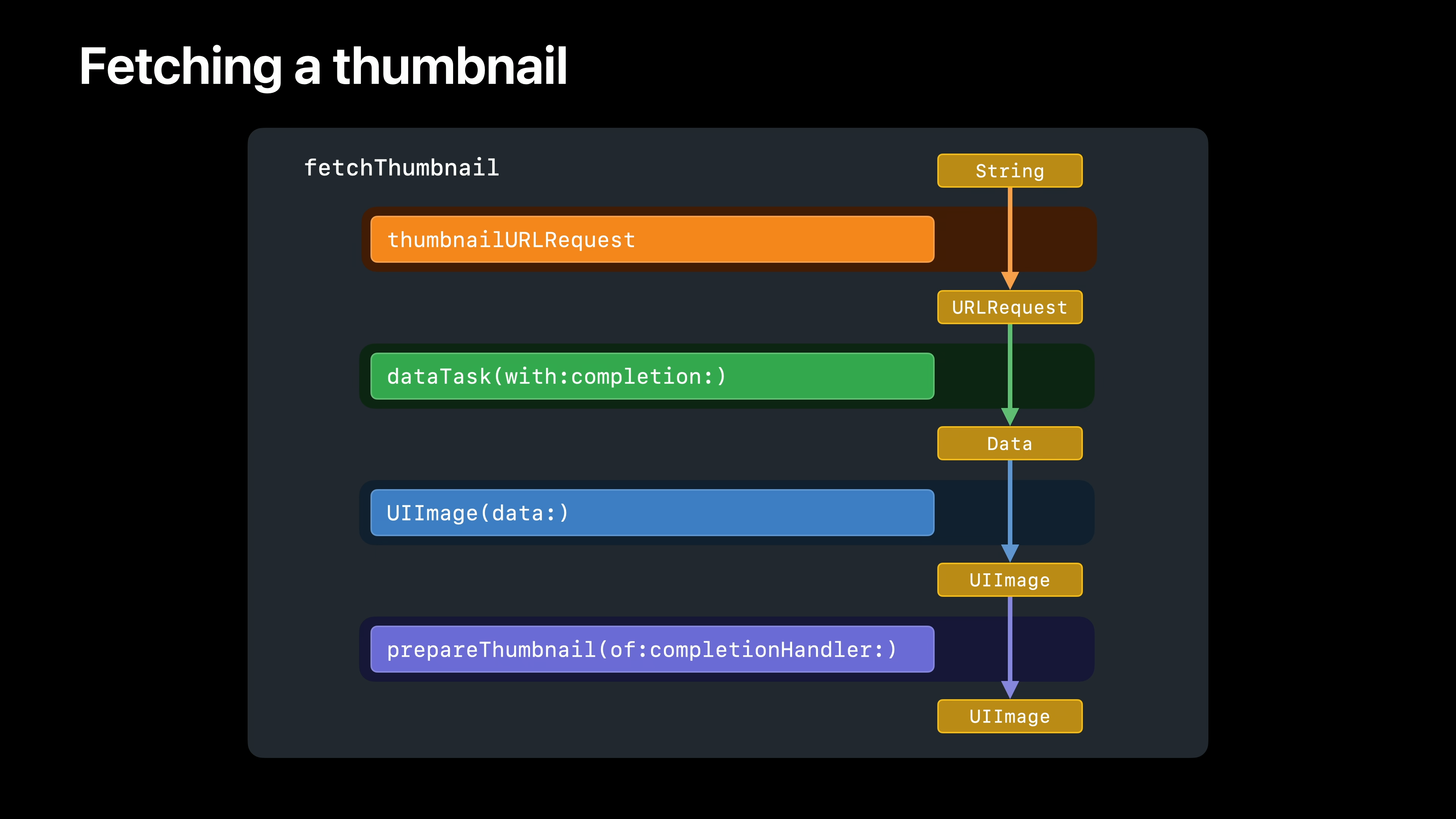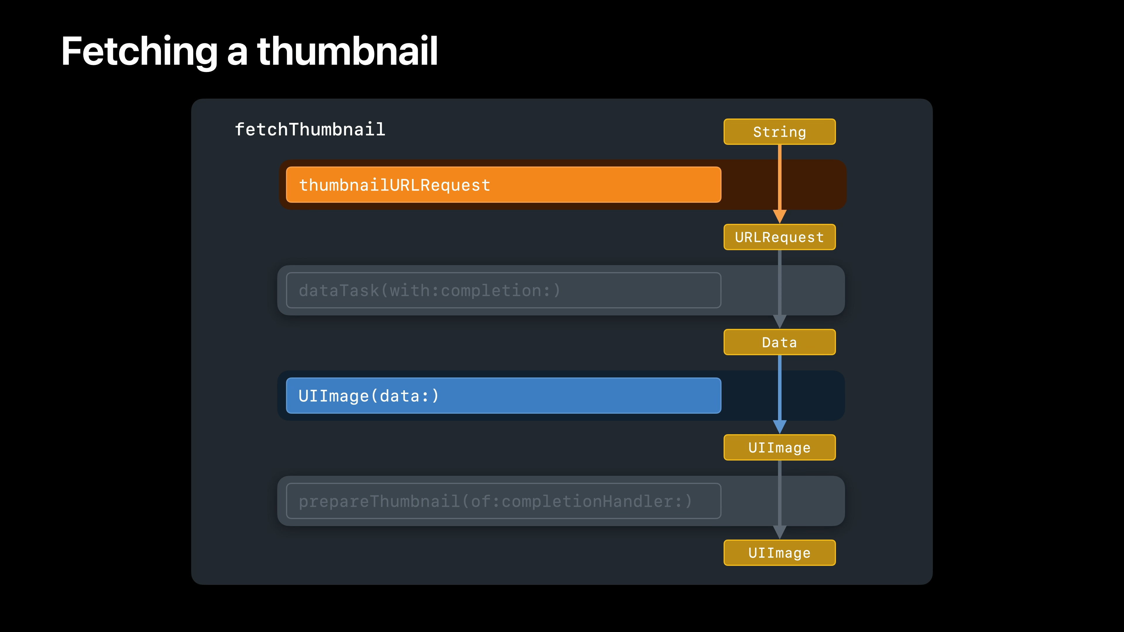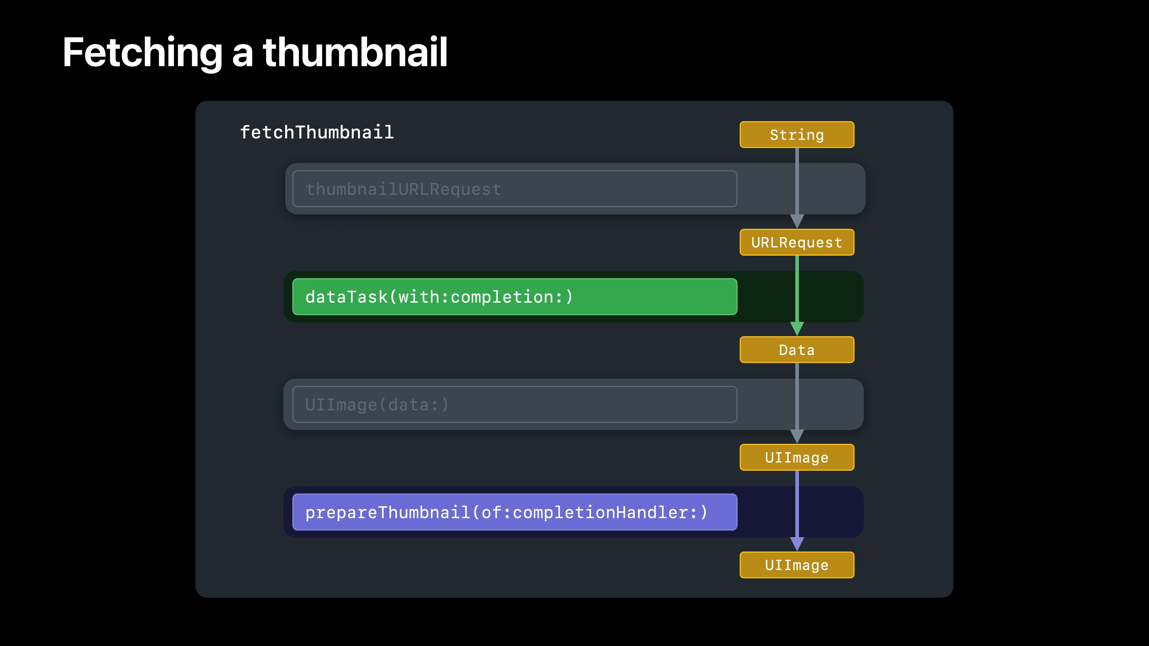 먼저 뷰 모델의 thumbnailURLRequest 메서드가 문자열에서 URLRequest를 생성합니다. 다음으로 URLSession의 dataTask 메서드가 해당 요청에 대한 데이터를 가져옵니다. 그런 다음 UIImage initWithData가 해당 데이터에서 이미지를 생성하고 마지막으로 UIImage의 prepareThumbnail 메서드가 원본 이미지에서 썸네일을 렌더링합니다. 이러한 각 작업은 이전 작업의 결과에 따라 달라집니다. 즉, 순서대로 수행해야 합니다.