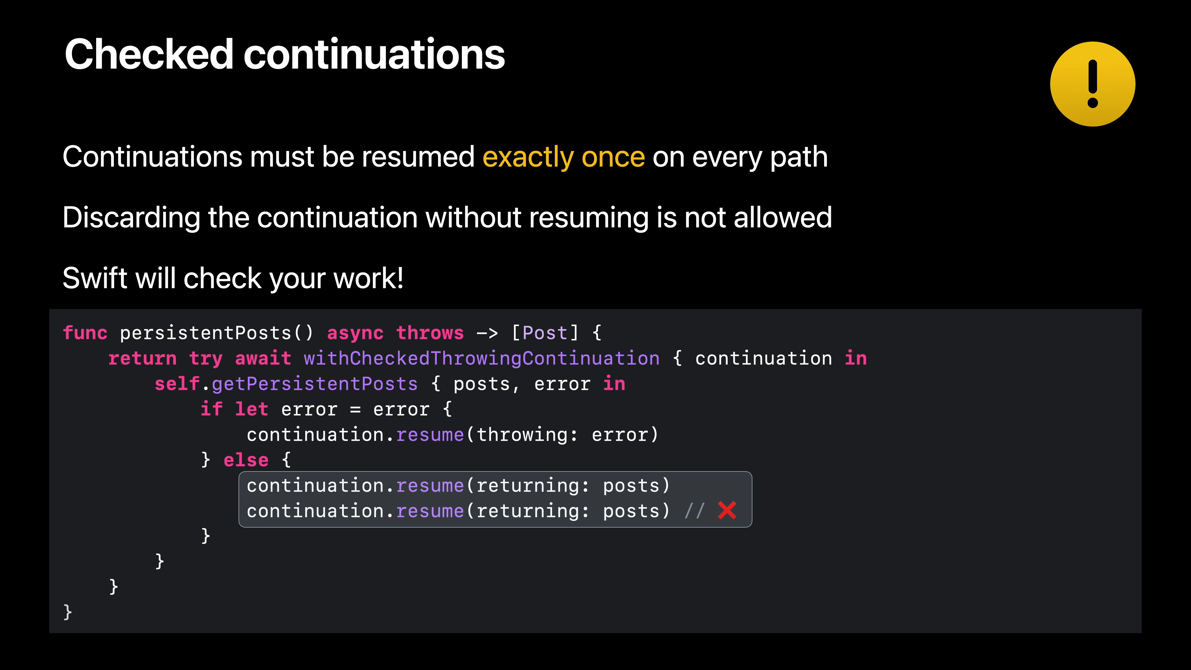 연속은 비동기 함수의 실행을 수동으로 제어할 수 있는 강력한 방법을 제공하지만 몇 가지 유의해야 할 사항이 있습니다. 연속에는 간단하지만 중요한 계약이 있습니다. Resume는 모든 경로에서 정확히 한 번만 호출해야 합니다. 하지만 걱정하지 마세요. 스위프트가 도와드리겠습니다.