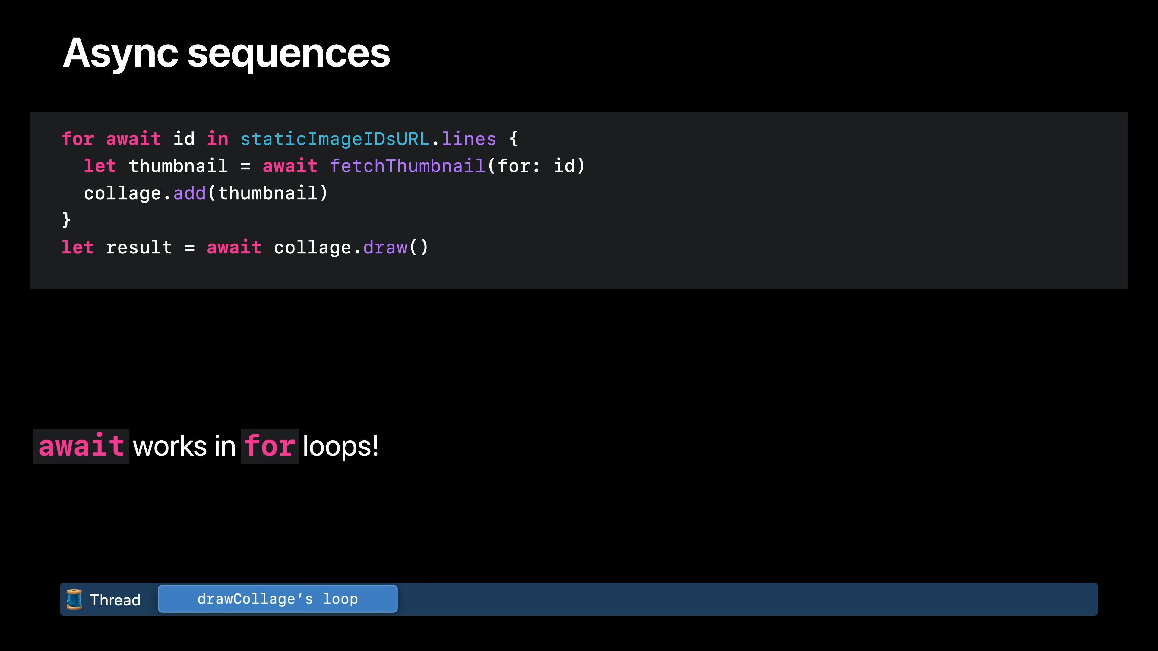 함수, 속성 및 이니셜라이저에서 표현식에 await을 사용하여 함수가 스레드 차단을 해제할 수 있는 위치를 나타낼 수 있습니다. 비동기 시퀀스를 반복하는 루프에도 await을 사용할 수 있습니다. 비동기 시퀀스는 요소를 비동기적으로 전달한다는 점을 제외하면 일반 시퀀스와 비슷합니다. 따라서 다음 항목을 가져올 때는 비동기식임을 나타내는 await 키워드로 표시해야 합니다.
