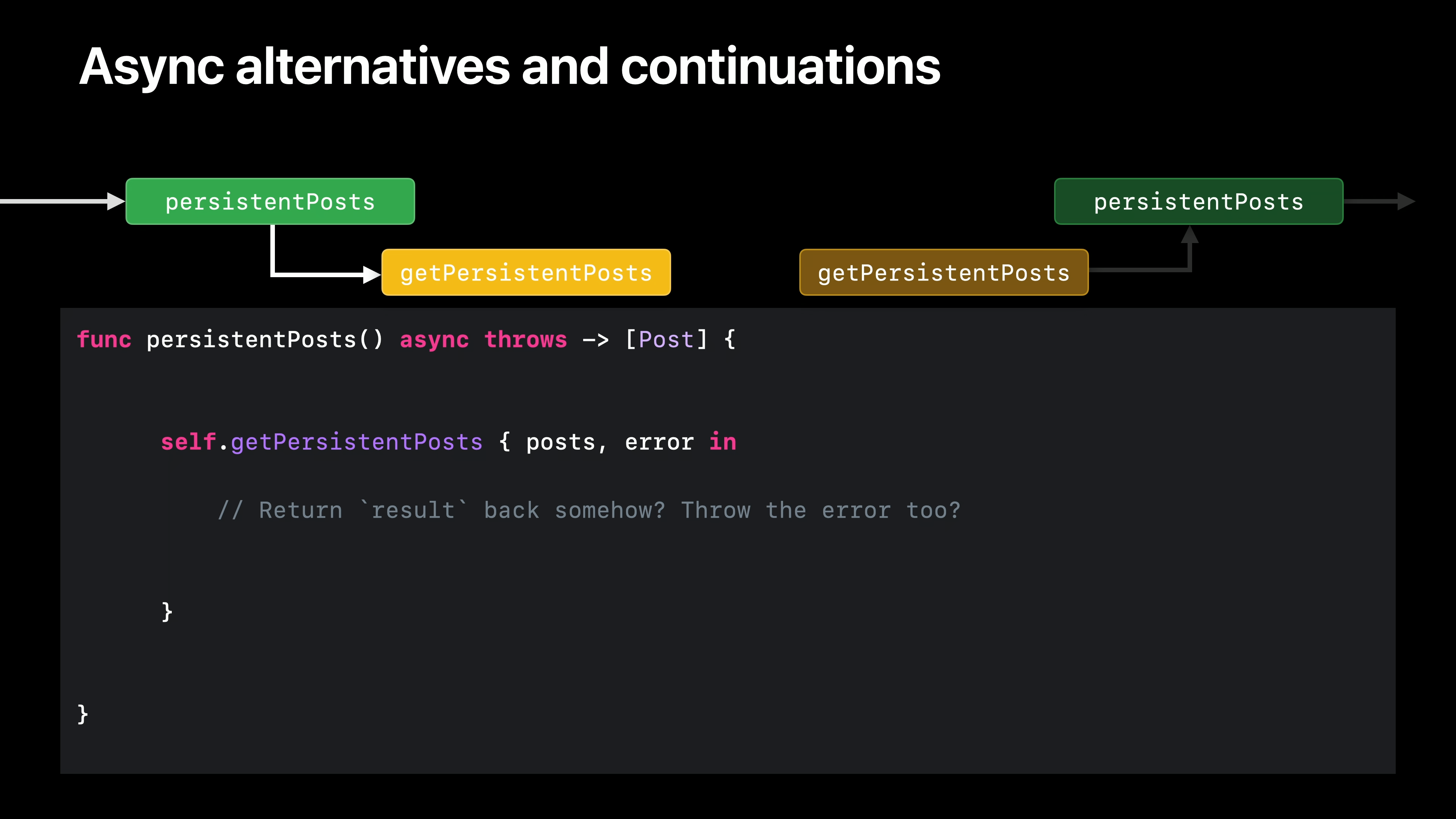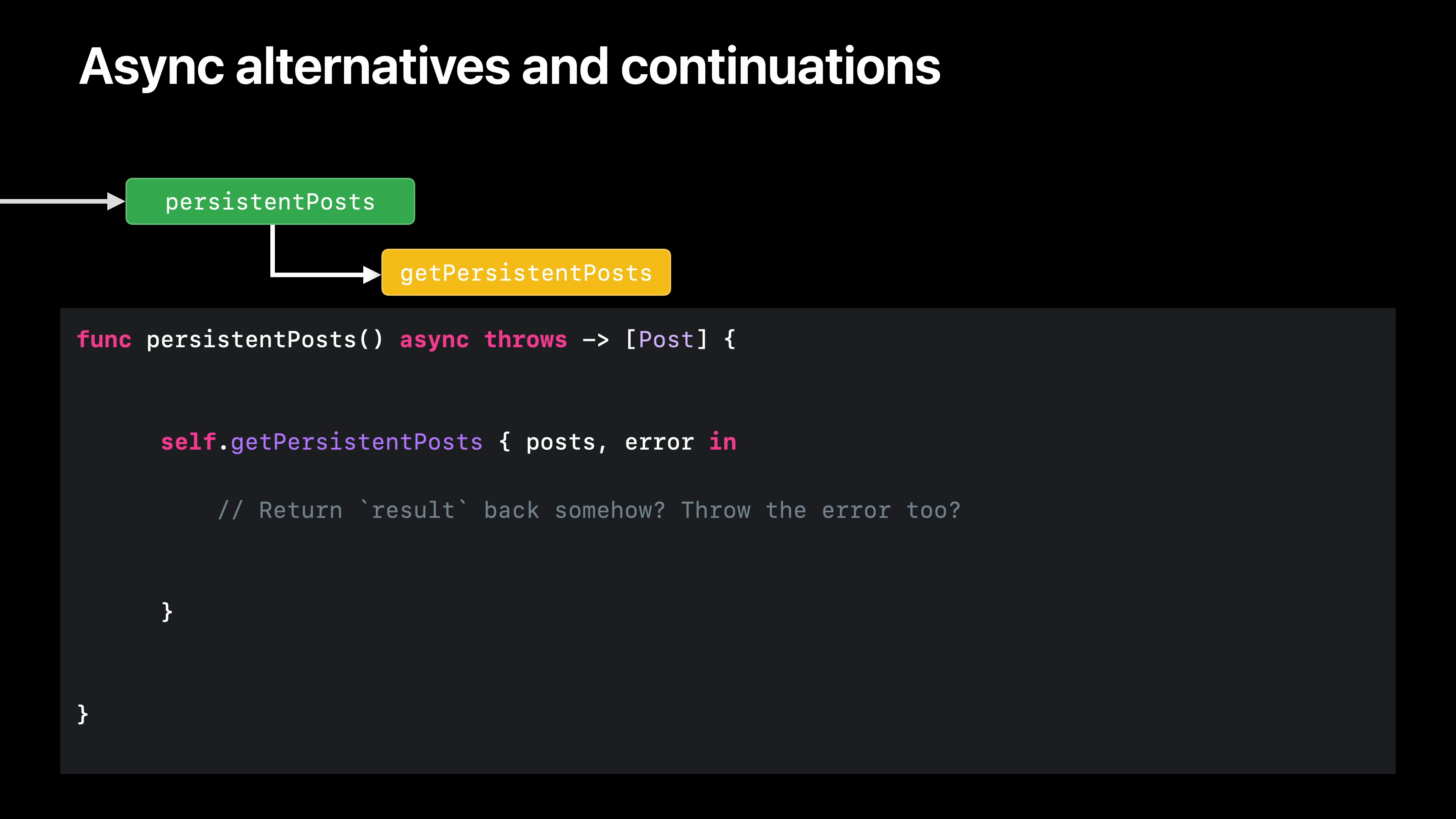 우리 앱에서는 이 getPersistentPosts 함수를 사용하여 코어 데이터 스토어에 지속된 모든 게시물을 검색합니다. 이 함수는 앱에서 비동기 썸네일 함수보다 훨씬 더 많은 곳에서 호출되므로 모든 곳에서 비동기를 사용하는 것은 정말 큰 변화일 것입니다. 그리고 NSAsynchronousFetchRequest를 사용하고 있기 때문에 이 함수는 비동기 함수를 대체할 수 있는 완벽한 후보인 것 같습니다. 먼저 비동기 함수를 만들고 반환값을 변환합니다. 이 함수는 에러를 발생시킬 수 있으므로 이 함수도 'throw'로 표시합니다.
