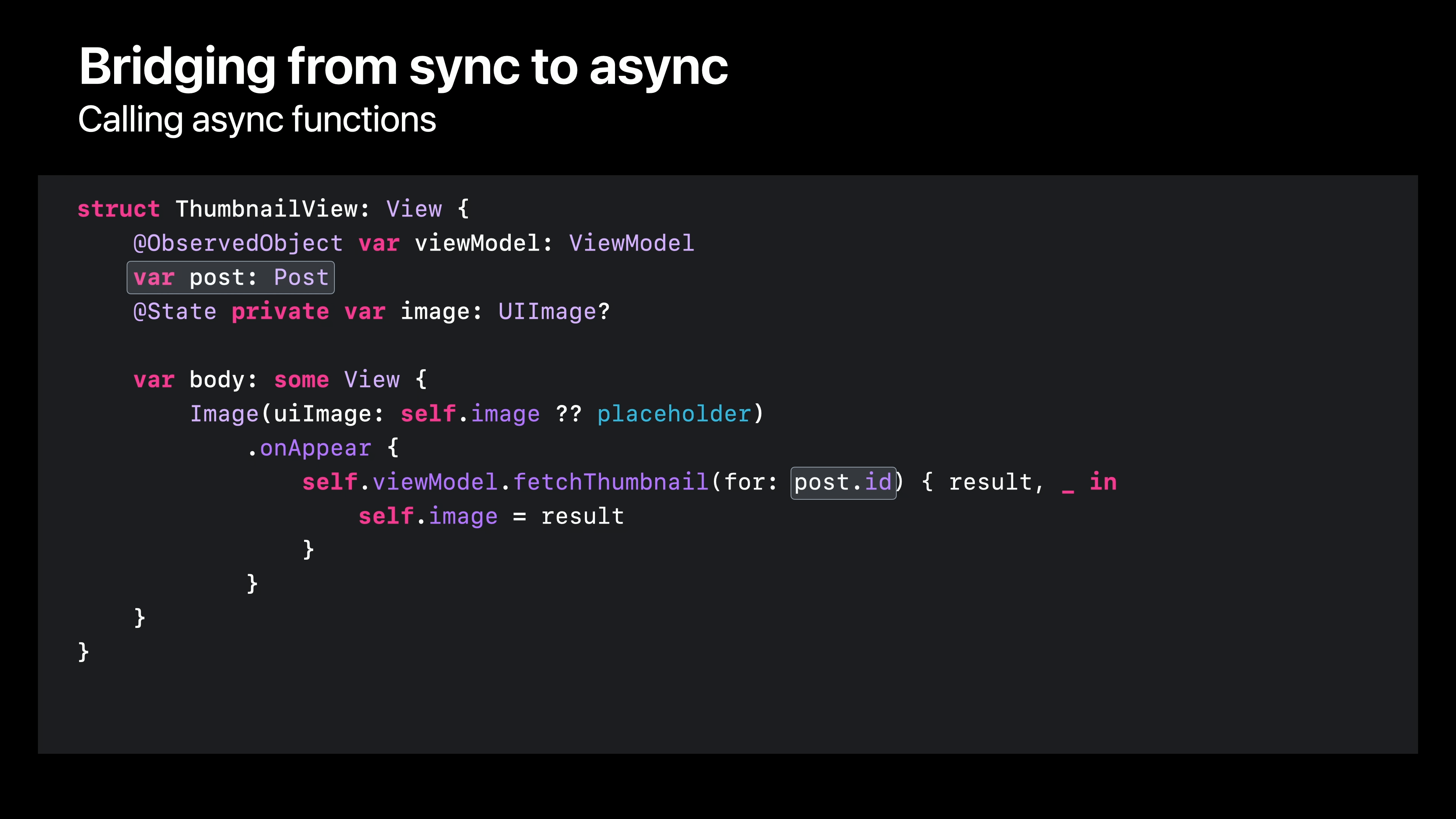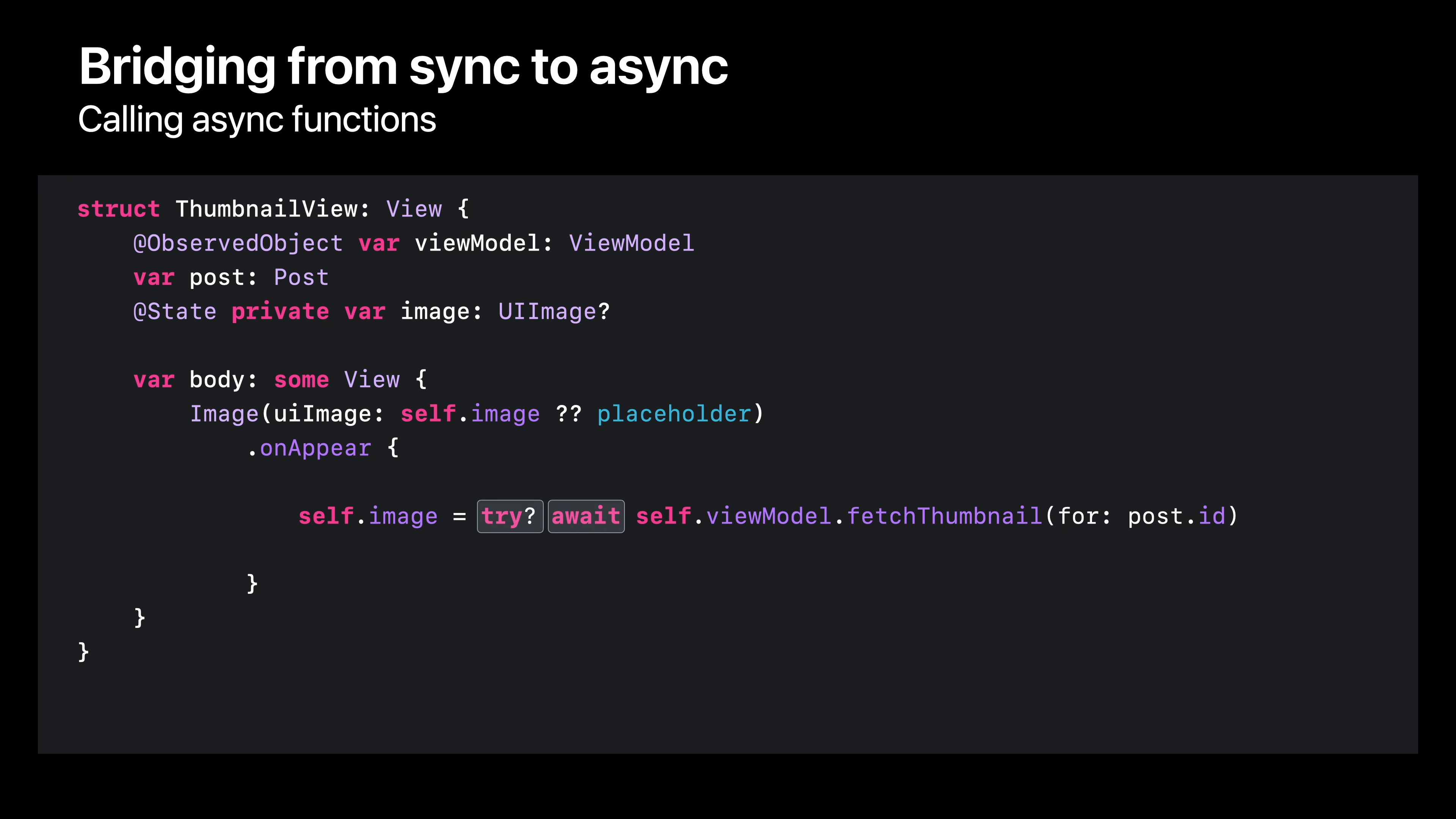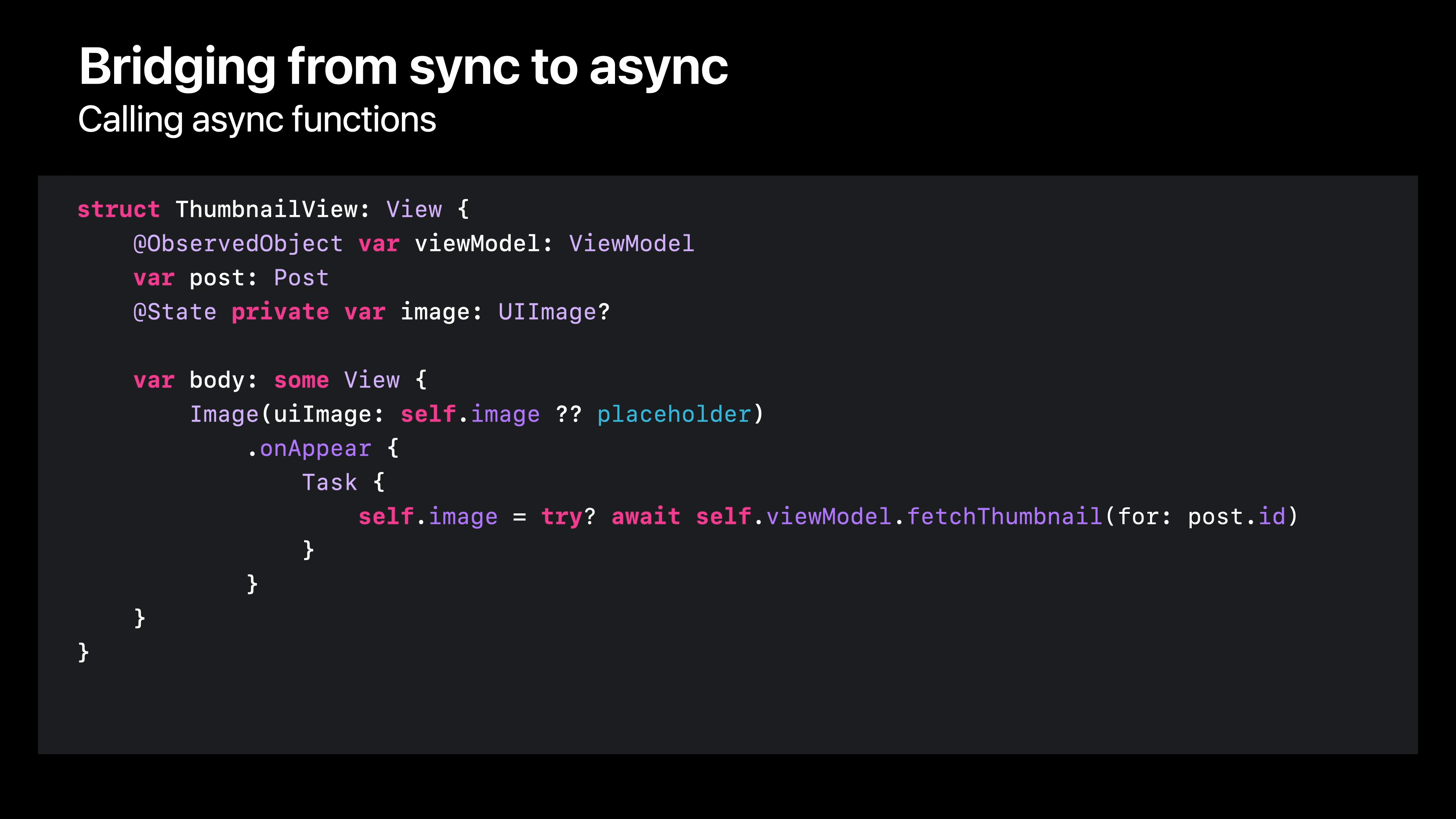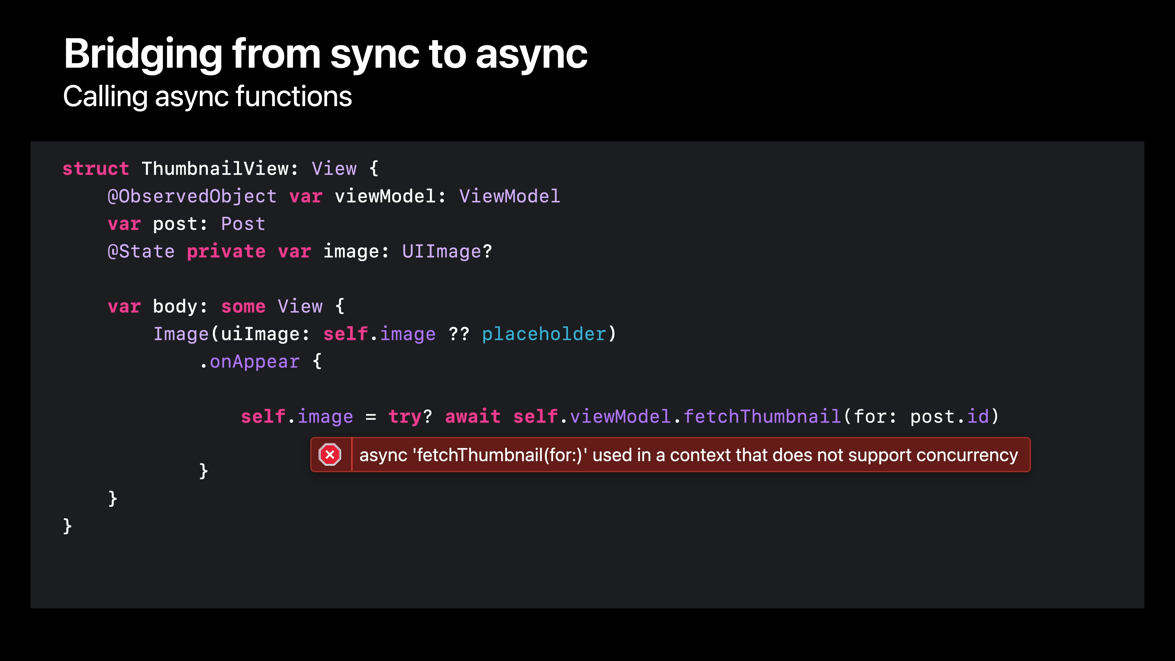 이미지 셀은 게시물로 생성되며, 각 게시물에는 뷰모델에 전달하여 썸네일을 비동기적으로 검색할 수 있도록 하는 ID가 있습니다. 테스트 코드에서 이 호출을 변환하는 방법을 이미 보셨으니 한 번 해보겠습니다. 먼저 완료 핸들러를 제거한 다음 오류를 처리하기 위해 “try”를 추가하고 비동기 함수 호출을 완료하기 위해 “await”을 추가합니다. 하지만 이 코드를 빌드하려고 하면 문제가 발생합니다. Swift 컴파일러는 자체적으로 비동기적이지 않은 컨텍스트에서는 비동기 함수를 호출할 수 없다고 말합니다. 여기서 onAppear 수정자는 일반 비동기 클로저를 사용하므로 동기 세계와 비동기 세계 사이의 간격을 메울 수 있는 방법이 필요합니다.