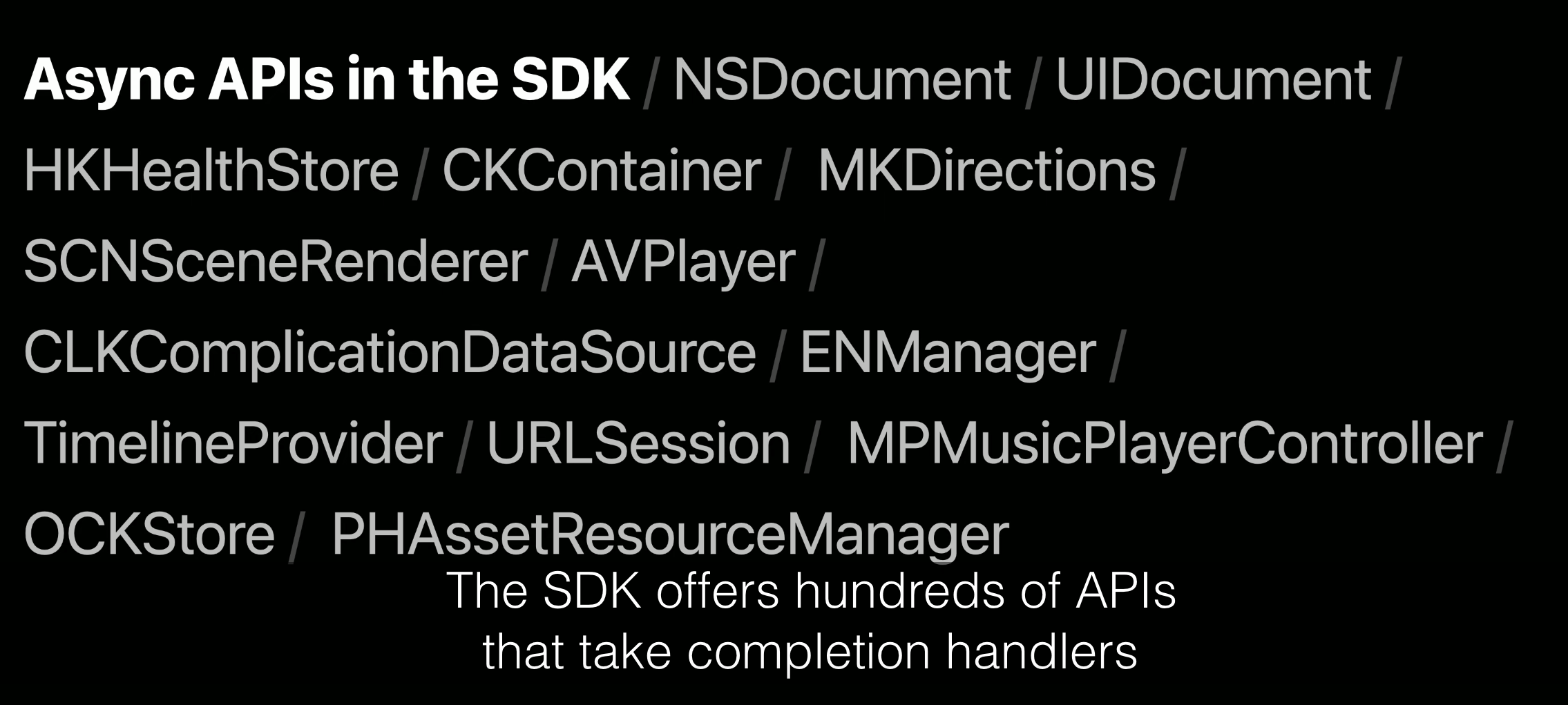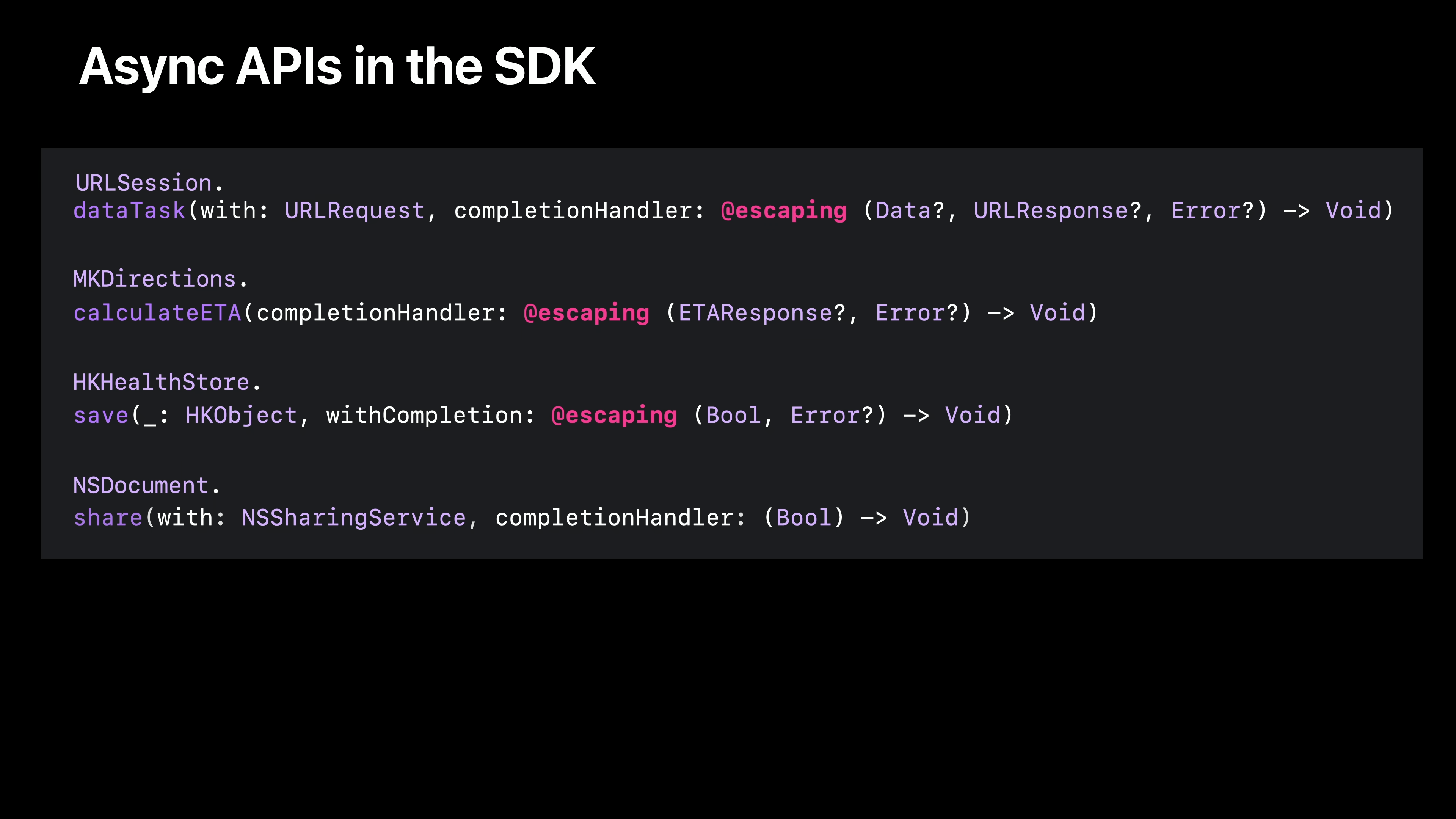 이 패턴은 항상 등장하며, 이 패턴에는 연속성이라는 이름이 있습니다. 이 세션에서 네이트와 저는 이미 연속의 많은 예제, 즉 완료 블록을 사용하는 메서드를 보여드렸습니다.