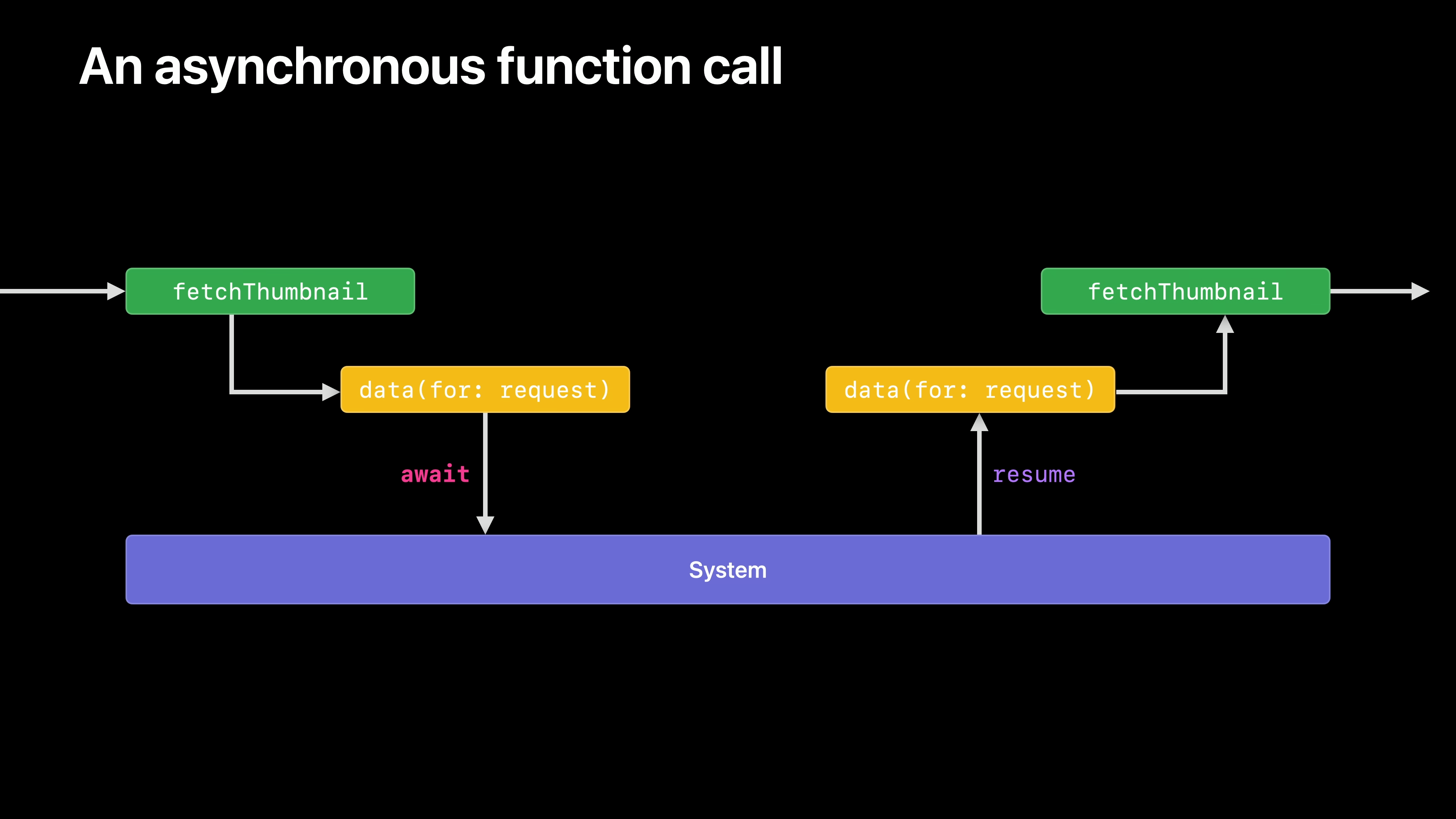 fetchThumbnail이 URLSession의 비동기 데이터 메서드를 호출하면 데이터 메서드는 비동기 함수만이 할 수 있는 특별한 방식인 일시 중단을 통해 스레드에서 실행을 중지합니다. 이는 스레드에 대한 제어권을 시스템에 넘기고 시스템에 URLSession의 데이터 메서드에 대한 작업 예약을 요청합니다.