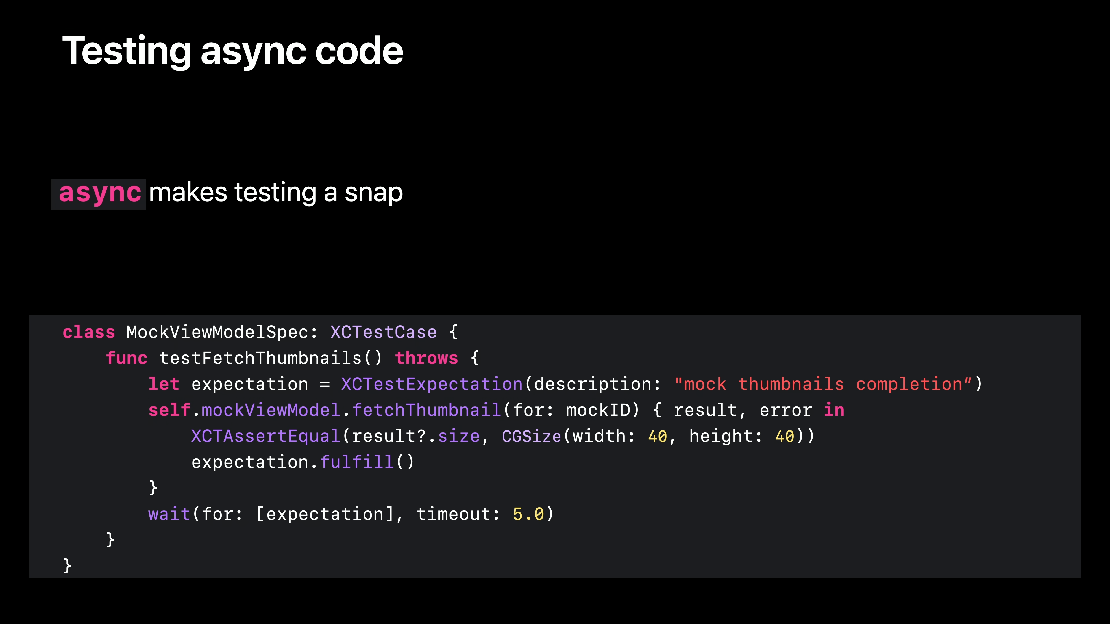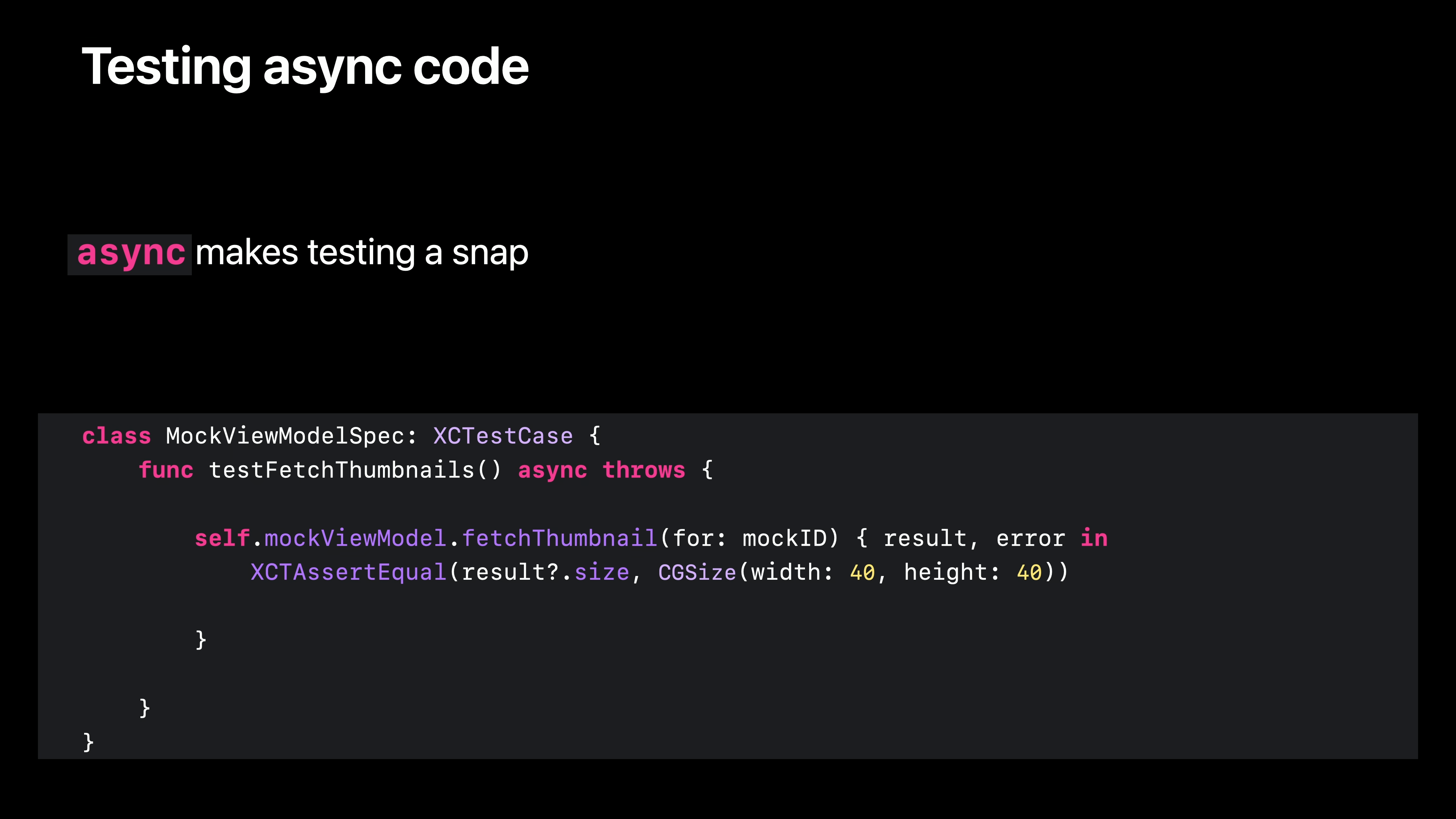 비동기 코드를 테스트하는 것이 동기 코드를 테스트하는 것만큼이나 쉬워지기를 원했기 때문에 XCTest는 기본적으로 비동기를 지원합니다. 기대값을 설정하고, 테스트 중인 API를 호출하고, 기대값을 이행한 다음 임의의 시간 동안 대기해야 하는 지루한 프로세스를 테스트 함수에 비동기 키워드를 추가하고, XCTest 기대값과 그 이행, 명시적 대기를 제거하고, 대신 앞서 보여드린 새로운 비동기 fetchThumbnail 함수 호출의 결과를 기다리는 것만큼 쉽게 테스트할 수 있게 되었습니다.