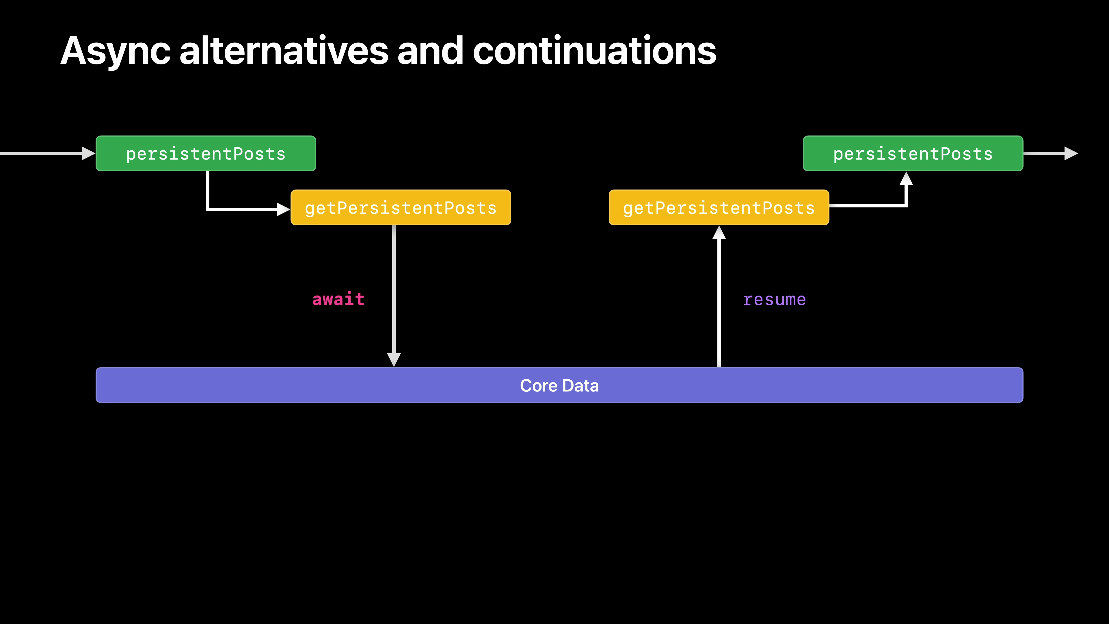 퍼시스턴트포스트의 비동기 버전이 호출되면 코어 데이터로 호출됩니다. 나중에 코어 데이터는 완료 핸들러를 호출하고 가져오기 요청의 결과를 전달합니다. 이 상황은 앞서 Nate가 보여드린 fetchThumbnail 함수가 일시 중단된 비동기 함수 호출을 재개하도록 코어 데이터가 아닌 시스템에 요청했을 때와 거의 동일하게 보입니다.