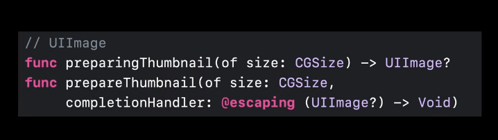UIImage 읽기 속성인 thumbnail에 getter async를 볼 수 있습니다 그래서 await를 사용할 수 있고 또한 Swift 5.5부터 getter에도