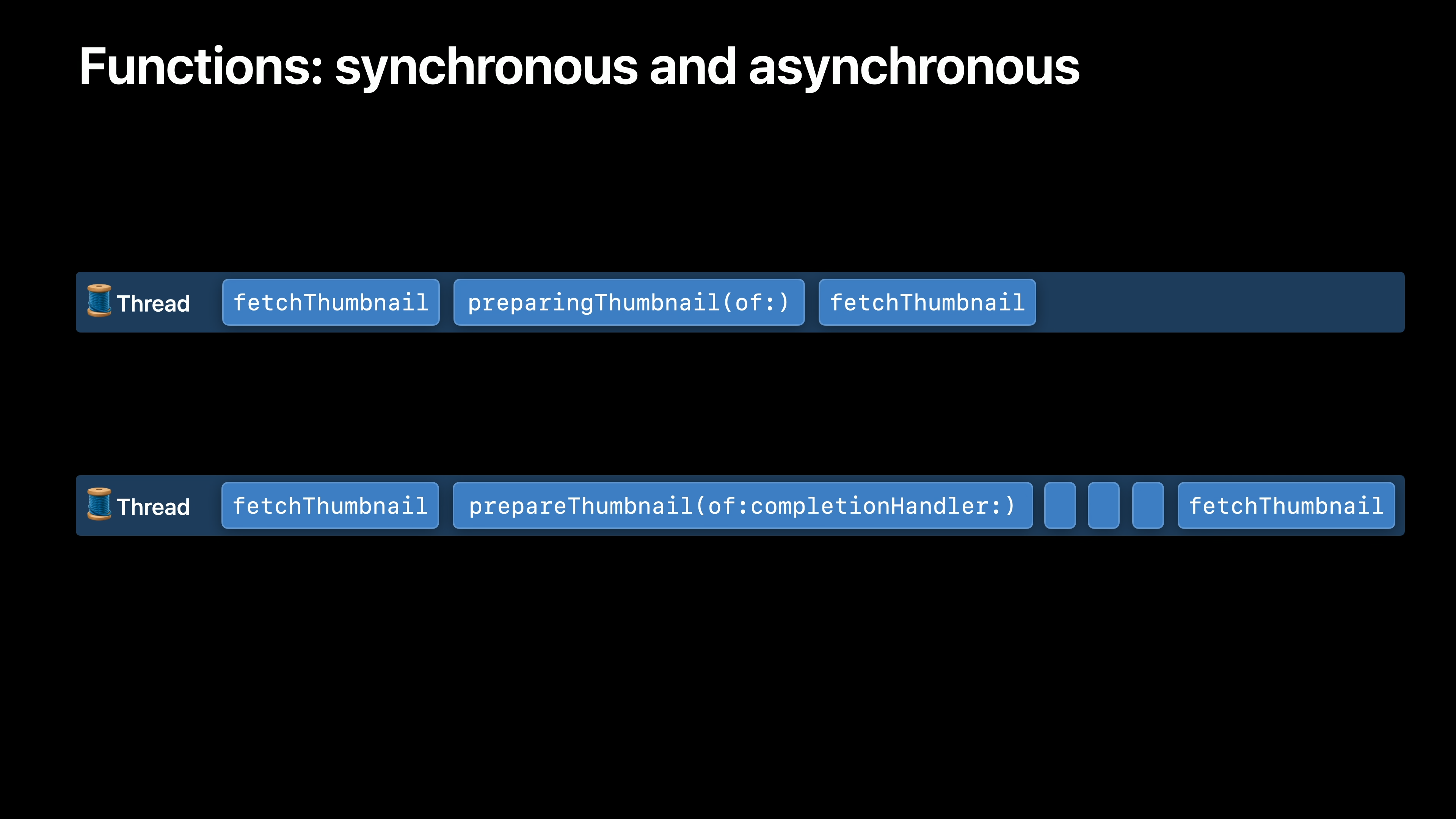 간단히 말해, 동기식 함수, 즉 일반적인 오래된 함수 호출 시 스레드는 해당 함수가 완료될 때까지 기다리면서 중지됩니다. 따라서 fetchThumbnail 함수가 UIKit에서 제공하는 동기식 함수인 prepareThumbnail을 호출하면 완료될 때까지 스레드는 다른 작업을 수행할 수 없습니다. 반대로, 해당 함수가 실행되는 동안 비동기 버전인 준비 썸네일(of:completionHandler:)을 호출하면 스레드는 다른 작업을 자유롭게 수행할 수 있습니다. 작업이 완료되면 완료 핸들러를 호출하여 알려줍니다. SDK는 많은 비동기 함수를 제공합니다. 이러한 함수는 몇 가지 다른 방식으로 완료되었음을 알려줍니다. 일부는 이와 같은 완료 핸들러를 사용합니다. 다른 것들은 델리게이트 콜백에 의존합니다. 그리고 많은 함수는 비동기로 표시되어 있으며 값만 반환합니다.