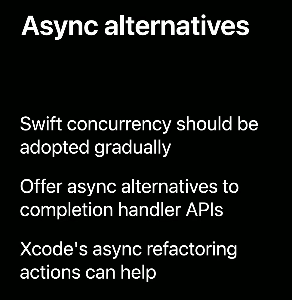 이 모든 것은 Swift가 사용자를 대신하여 비동기 대안을 생성하는 상황의 예시입니다. 그러나 코드에는 필연적으로 비동기 대안을 직접 만들어야 하는 부분이 있을 것입니다.