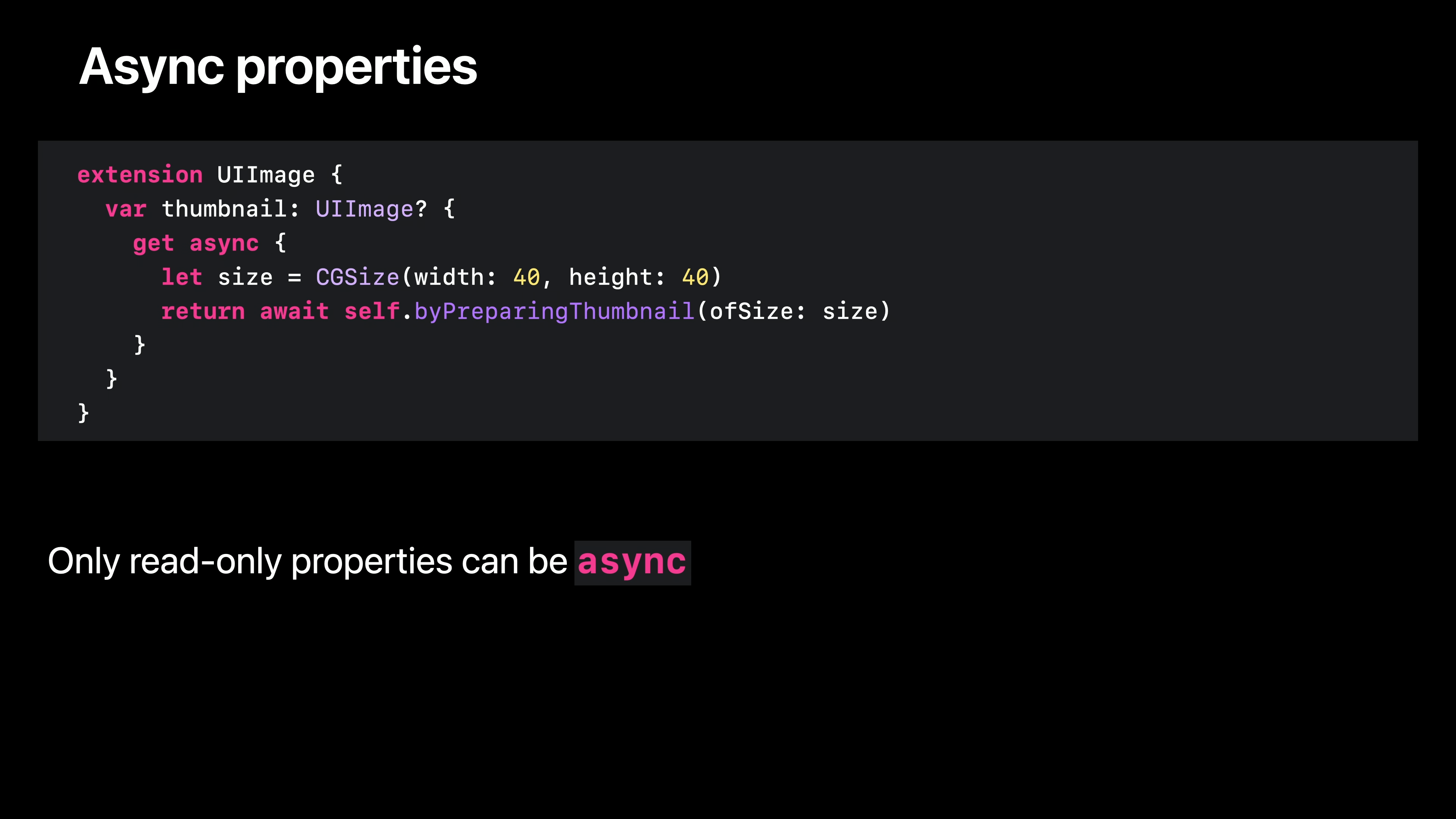 몇 가지 주목해야 할 점이 있습니다. 첫째, 명시적인 getter가 있습니다. 이는 프로퍼티를 비동기로 표시하는 데 필요합니다. Swift 5.5부터는 프로퍼티 getter가 throw도 가능합니다. 그리고 비동기 함수 시그니처와 마찬가지로, 프로퍼티가 비동기인 동시에 throw인 경우 비동기 키워드는 throw 바로 앞에 오게 됩니다.