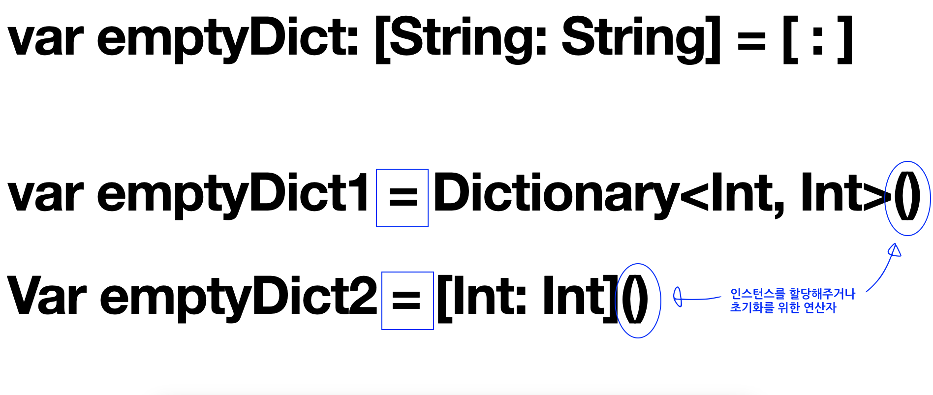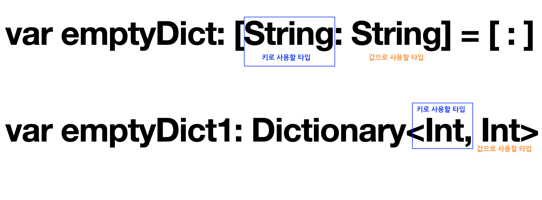그리고 딕셔너리는 유추와 빈배열을 바로 넣을 수 있답니다