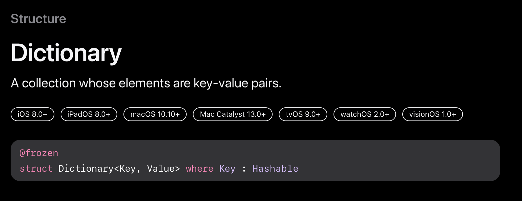 Hashable하여 Set과 마찬가지로 저장되는 형식을 가지고 있답니다