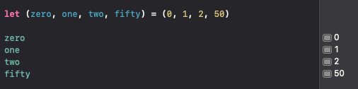 이를 해체하여 값을 zero, one, two, fifty라는 변수에 할당하고 있는걸 확인할 수 있습니다