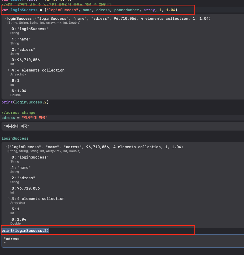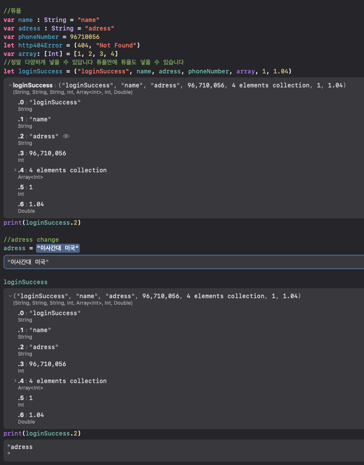 수정하면 Tuple내에 저장된 변수에 리터럴이 변경되었는지 확인해봅시다