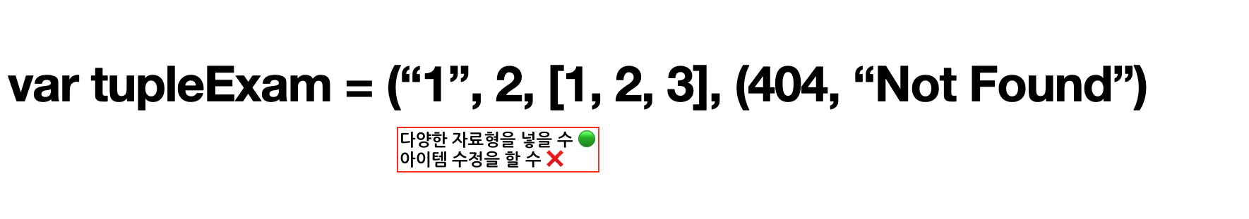 튜플안에 값은 어떠한 타입도 위에서 말하듯이 가능하고 서로 같은 타입일