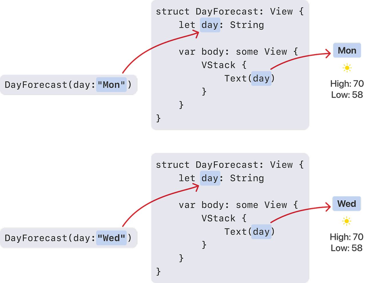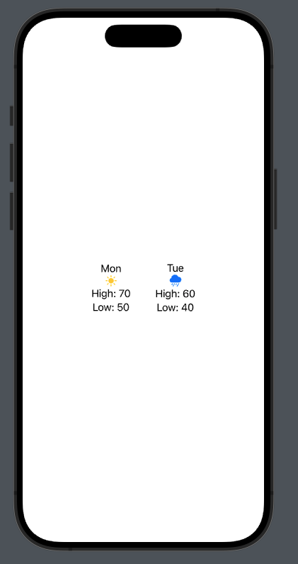 DayForecast(day: "Mon", isRainy: false, high: 70, low: 50)
