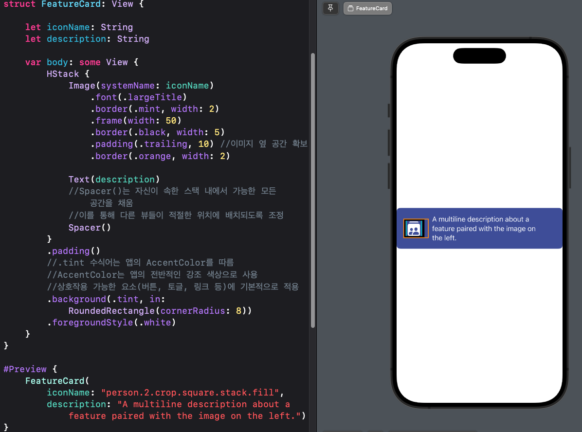 | SwiftUI | 다양한 정렬 및 레이아웃(HStack / VStack / ZStack) (0) | 2024.08.07 |