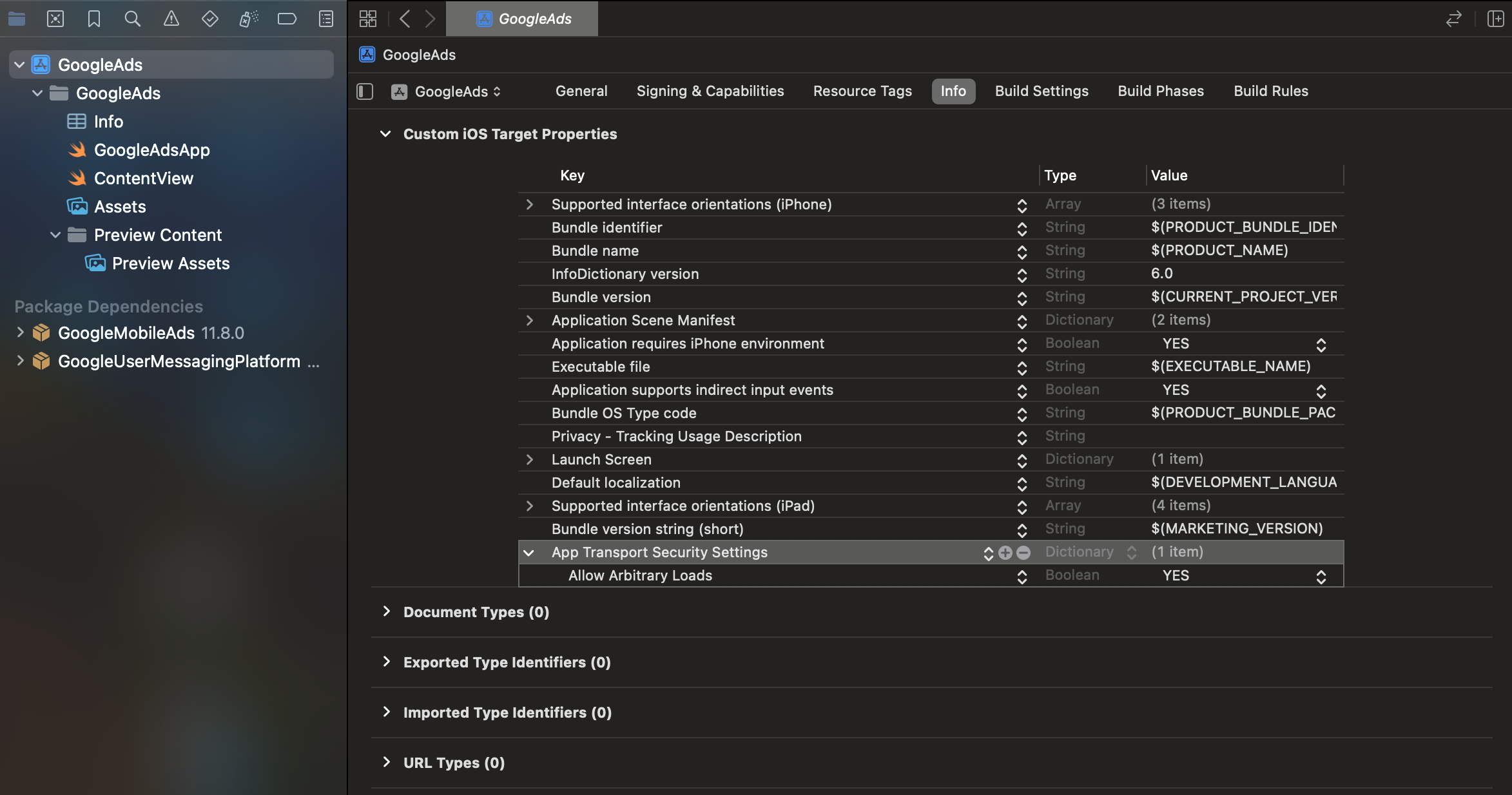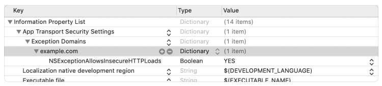 NSAllowsArbitraryLoads는 모든 네트워크 연결에 대해 ATS의 활성화 여부를 나타내고 Bool 값으로 기본값은 NO이다. YES로 할당한 경우 모든 도메인에 대해서 ATS를 적용하지 않고 NSExceptionDomains에서 추가한 도메인은 예외