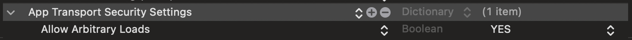 NSAllowsArbitraryLoads는 모든 네트워크 연결에 대해 ATS의 활성화 여부를 나타내고 Bool 값으로 기본값은 NO이다. YES로 할당한 경우 모든 도메인에 대해서 ATS를 적용하지 않고 NSExceptionDomains에서 추가한 도메인은 예외