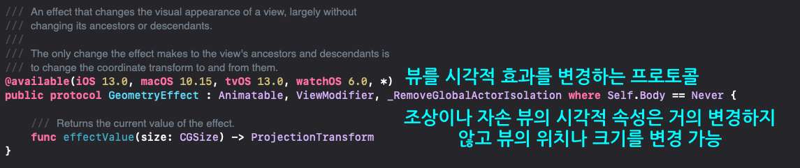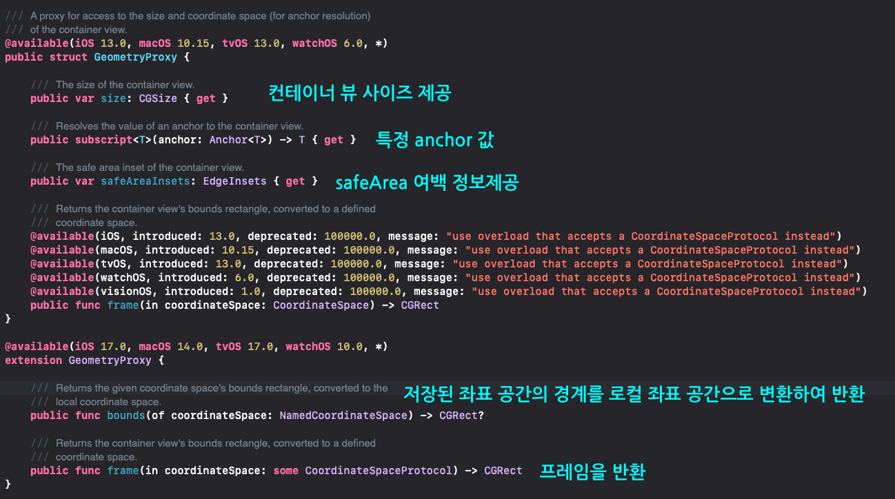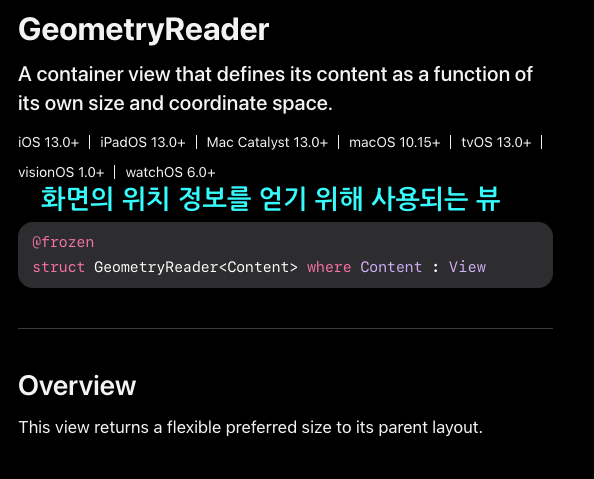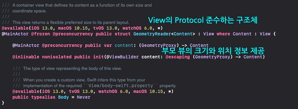 뷰가 자신의 크기와 좌표 공간에 따라 콘텐츠를 정의할 수 있도록 해주는 컨테이너 뷰라고 하고 있습니다