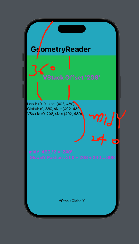 Text("midY '480 / 2 = '240'\n GlobalY Postion : 360 + 208 + 240 = 808 ")