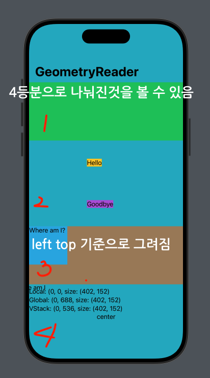 GeometryReader의 시작위치는 VStack 내부에 Rectangle 208 아래에 위치하고 있습니다