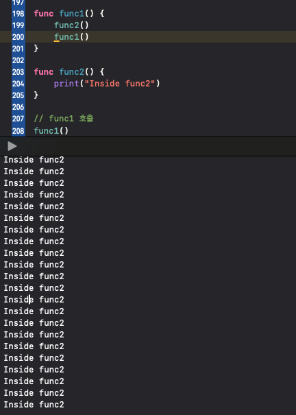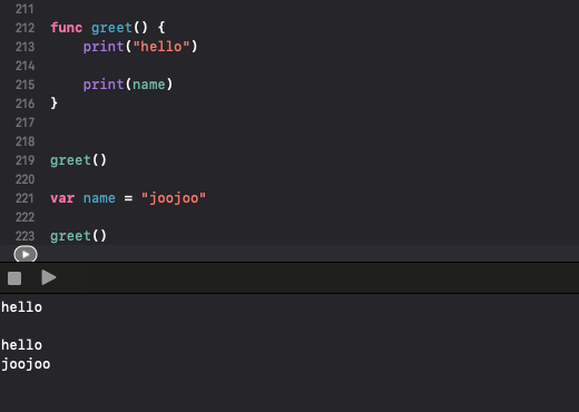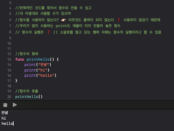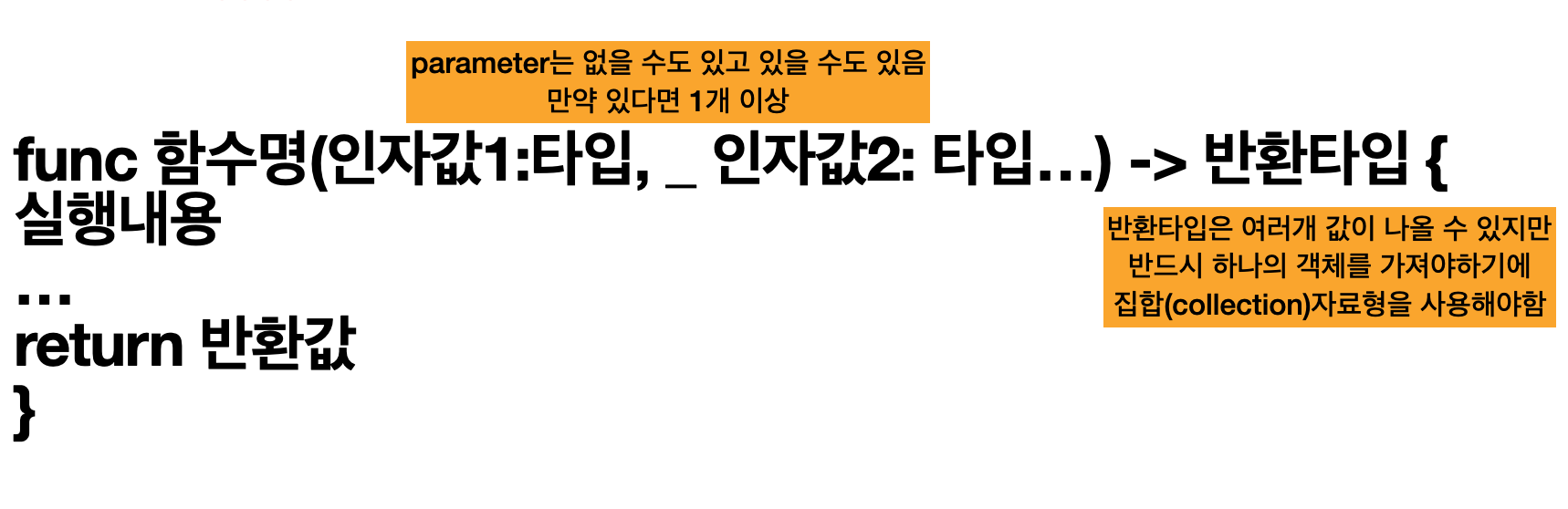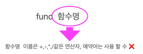 함수를 정의하기 위해서 반드시 앞에 func 키워드를 사용해야합니다