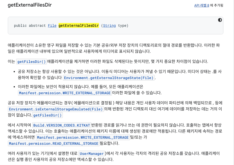 대신 getExternalFilesDir()을 사용하여 앱 전용 디렉토리 경로를 활용해야 합니다.