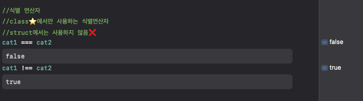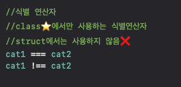 클래스는 참조타입으로 두 객체가 동일한 메모리 공간을 가리키는지 확인할 때 식별 연산자를 사용합니다
