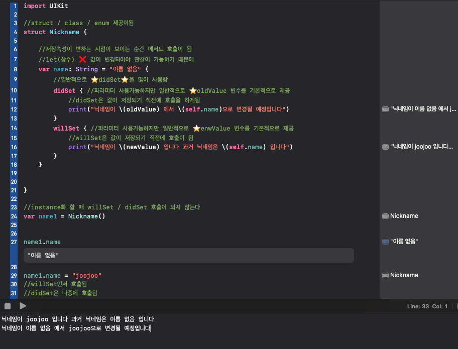 매개상수는 didSet(매개상수) / willSet(매개상수)를 넣을 수 있지만