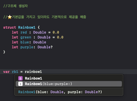 하지만 값을 초기화 하지 않는 부분만 자동으로 멤버와이즈 이니셜라이저를 제공하게됩니다