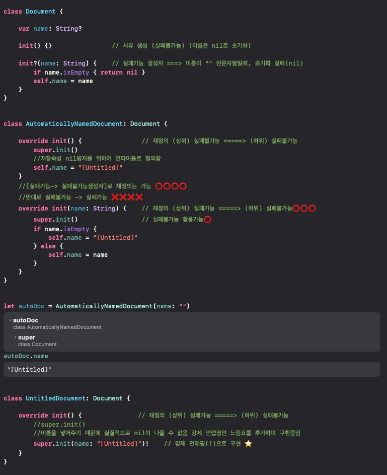 (하위) 실패불가능 재정의(가능) - 강제 언래핑 활용 가능 init! init? |