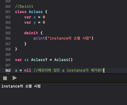 swift에서는 소멸자를 자동참조계산(ARC)형식을 통해 메모리를 관리하기 때문에