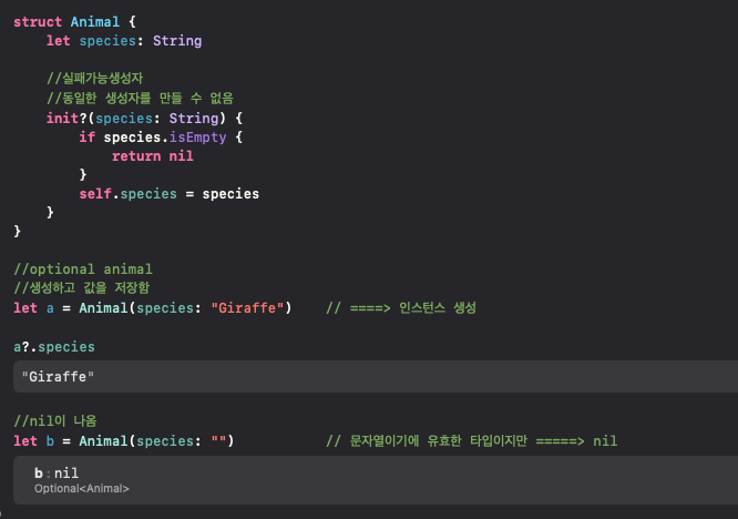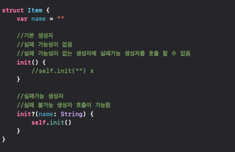 생성자에?를 붙여서 init?라고 정의하면 실패가능 생성자 입니다