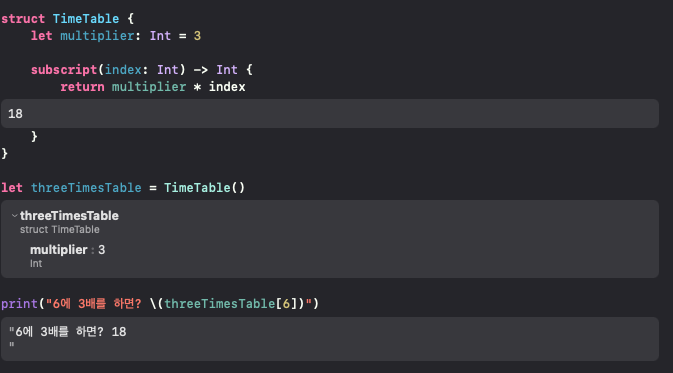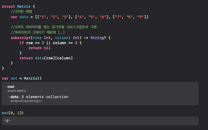 여기서 확인할 수 있는건 subscript에 매개변수를 자유로 넣을 수 있고