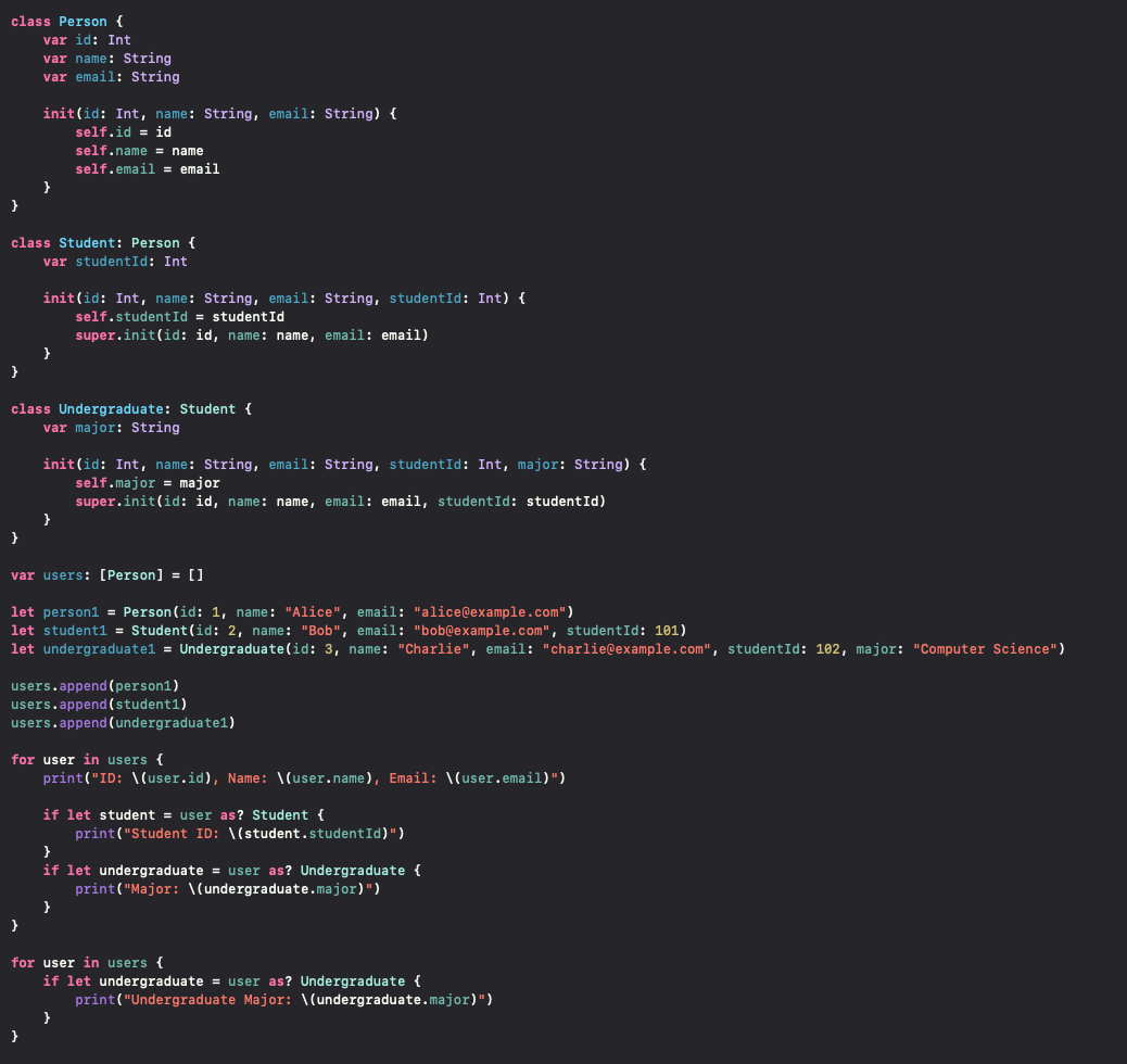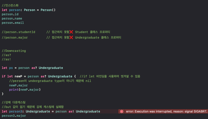 마지막에 오류난 이유는 person인스턴스를 undergraduate 로 강제 캐스팅 하려고하기에 오류가 납니다