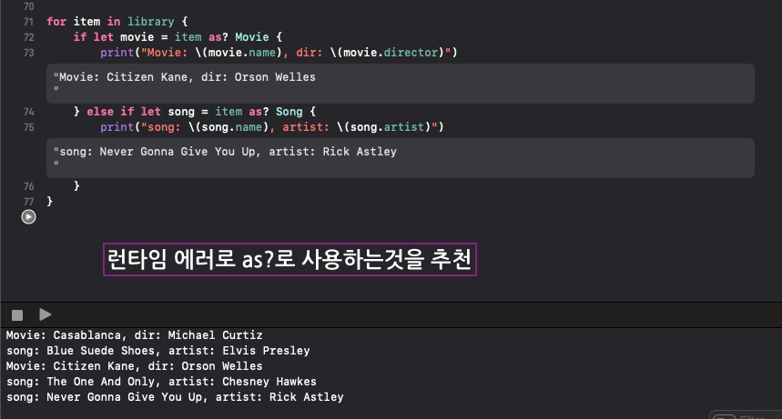 강제 캐스팅(as!)은 캐스팅에 실패하게 되면 런타임 오류가 나게 됩니다