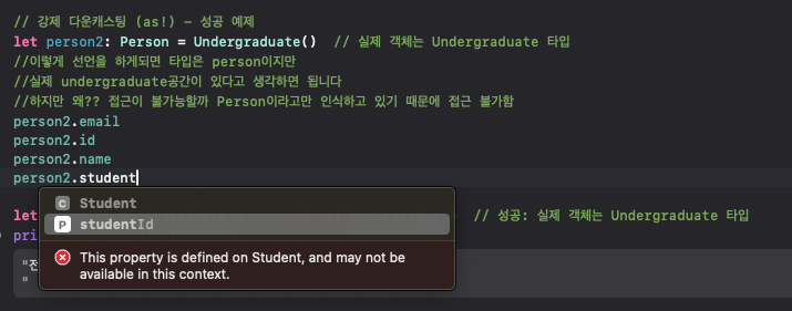하지만 person2는 실제로 Undergraduate 타입의 객체를 가리키고 있더라도