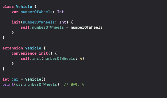 확장에서 편의 생성자를 추가하여 값 4개의 바퀴를 가지는 Vehicle을 생성할 수 있습니다