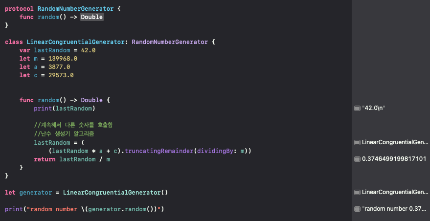 프로토콜로 input/output이 있는 메서드인 random()을 만들어주고