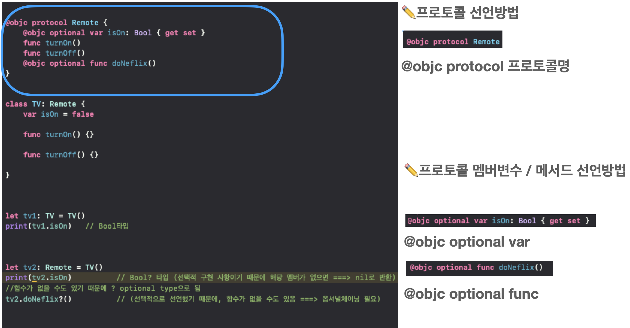 그리고 멤버 앞에는 @objc optional 이라고 추가하면 됩니다