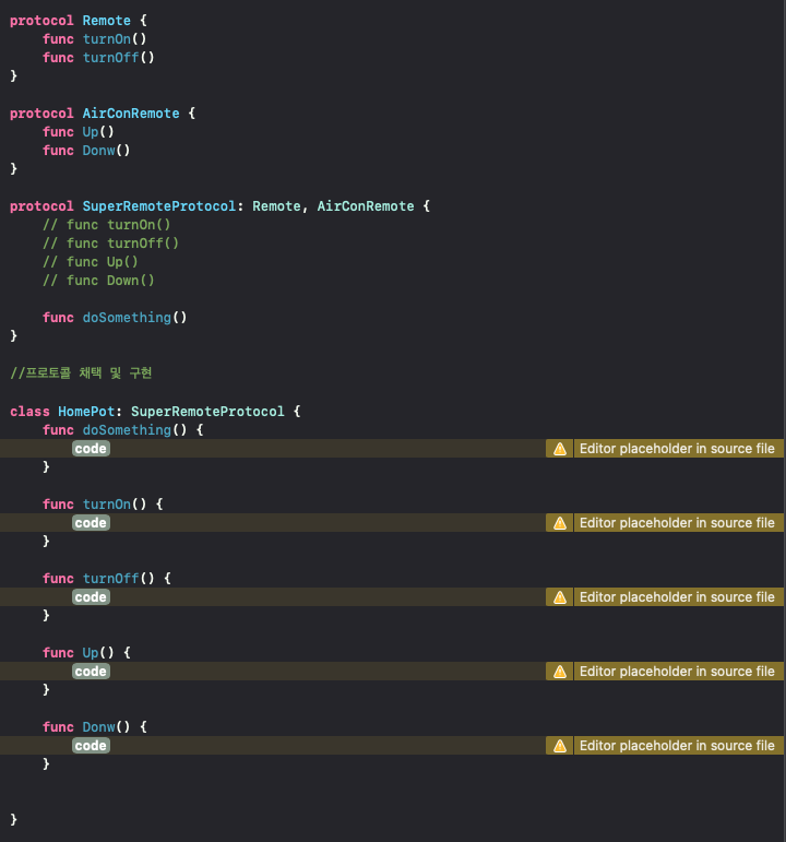 상속 구조를 만들게 되면 상속한 프로토콜에서 다 구현을 하지 않아도 됩니다